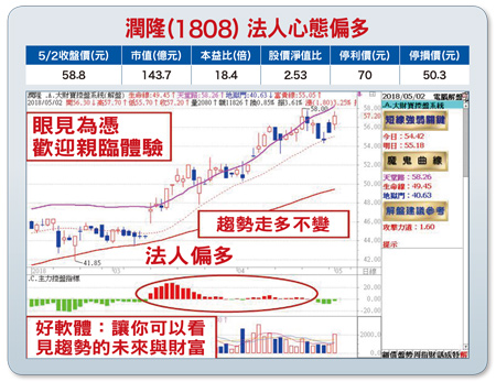 【個股推薦】潤隆(1808)業務主要分為營建事業及環保科技資源回收處理業務等。主要利基題材有:(1)首季獲利大噴發,每股賺三.八二元:首季在基隆「信義城」、台南「真愛」兩大案貢獻下,營運表現優於市場預期,營收達五○.七四億元,年增九六八.二%,毛利率更大增九.二個百分點達二八.五%,營業利益達一一.一六億元,年增一三八.五倍,稅後純益達九.三二億元,更較去年同期大增二三二倍,EPS三.八二元,創單季新高。(2)五大案加持,全年力拚一個股本:銷售七成、總銷六一.六一億元「NTC國家商貿中心」進入完工交屋入帳,將是第二季重點業績來源。總銷三二.五八億元的台中新案「潤隆」目前銷售率近四成,預計六月完工入帳,將挹注第三季營運。總銷五.七七億元的汐止「森學苑」已完工,若後續成屋去化不錯,也有機會貢獻業績。今年潤隆在五大案加持下,獲利不僅可望挑戰一個股本,呈現跳躍性成長,更有機會同步寫下歷史新高紀錄。此外,包括板橋永翠案一七.九三億元、基隆香格里拉一七八.一一億元希望五月拿到建照後推出;桃園中路案二○.五八億元計畫第二季推出;新竹與親家建設合建案(光武段)目前變更建照中,目標第二季推出,總銷約五九.三八億元;高雄福東段二八.二七億元新案,預計七、八月推出,全年新案已備妥高達二六六億元,為未來三至五年業績暖身。配合短中長期均線全面走揚、外資買盤加持,在籌碼面及技術面均處於相對有利條件下,後市仍將有強彈續漲再創新高的機會可期,逢低仍值得留意(※基本面資料若有異動,依公開資訊觀測站最新訊息為主)。【操作建議】低接不追高,下檔守穩前低五○.三元關卡不破,逢低於富貴線附近仍可留意,配合趨勢走多,一旦控盤指標及攻擊力道可再度雙雙翻紅轉強,後市行情仍將有續漲機會,設好停損停利(詳見附圖說明)。