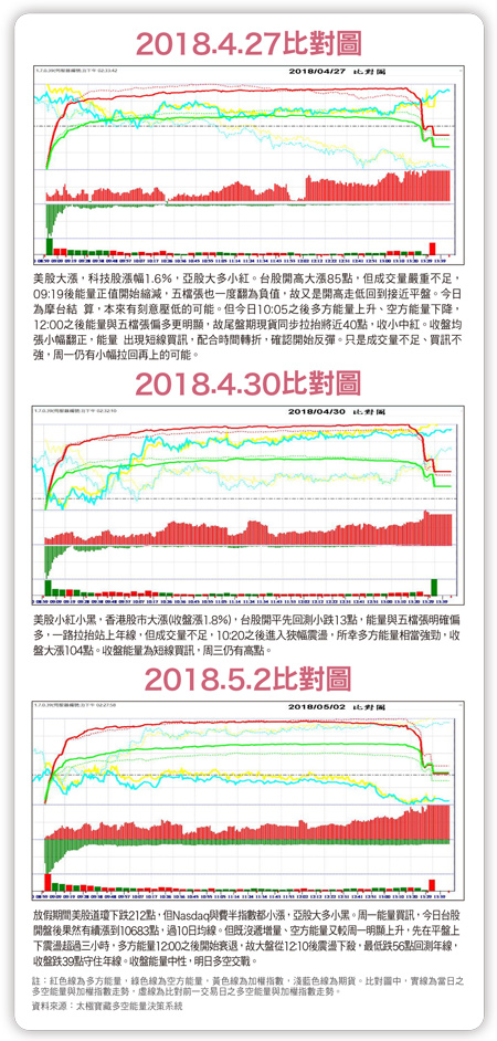 四月二十四日台股加權指數跌破年線,二十五日續跌盤中跌破一○五○○點大關,市場氣氛頗為悲觀,但當天我在本欄已跟各位說明,雖然趨勢明確偏空,但就周線而言,上周為一一二七○高點拉回第十三周時間轉折,有見波段低點的機會,密切觀察有無買訊。上周四(四月二十六日)大盤又下跌七十一點,收盤正式跌破一○五○○點大關,台股恐慌氣氛更濃。但我更進一步強調,除了周線為一一二七○高點拉回第十三周時間轉折,四月二十七日到三十日,為四月十一日高點一一○一六點拉回第十三天時間轉折,因此,下殺不可追殺,反而可以注意買點。上周五(四月二十七日)美股大漲,科技股漲幅一.六%,亞股大多小紅。台股開高大漲八十五點,但成交量嚴重不足,九點十九分後能量正值開始縮減,五檔張也一度翻為負值,故又是開高走低回到接近平盤。當天為摩台結算,本來有刻意壓低的可能,但十點零五分之後多方能量上升、空方能量下降,十二點之後能量與五檔張偏多更明顯,故尾盤期現貨同步拉抬將近四十點,收小中紅六十四點。收盤均張小幅翻正,能量出現短線買訊,配合時間轉折,確認開始反彈。上周五美股小紅小黑,本周一(四月三十日)港股大漲(收盤漲一.八%),台股開平先回測小跌十三點,能量與五檔張明確偏多,遂一路拉抬站上年線。但成交量不足,十點二十分之後進入狹幅震盪,所幸多方能量相當強勁,收盤大漲一○四點。收盤能量為短線買訊,表示周三仍有高點。但因成交量不足、買訊不強,很難一次突破四月二十四日長黑K棒高點一○六九二點。五月一日勞動節放假期間,美股道瓊下跌二一二點,但Nasdaq與費半指數都小漲,亞股大多小黑。周一能量買訊,五月二日台股開盤後果然有續漲到一○六八三點,過十日均線,果然過不了一○六九二點。既沒遞增量,空方能量又較周一明顯上升,先在平盤上下震盪超過三小時,多方能量十二點之後開始衰退,故大盤從十二點十分後震盪下殺,最低跌五十六點回測年線,收盤跌三十九點守住年線。收盤能量中性,隔天多空交戰。五月三日凌晨二點,聯準會利率決議,市場普遍預測六月升息。不論美股如何反應,由於台股在周、日雙重時間轉折點,出現能量短線買訊,因此,就算有利空回測,也是打第二支腳。若美股以上漲反應,不排除台股五月三日直接上攻。但要突破四月二十四日長黑K棒高點一○六九二點,必須配合遞增量,且能量出現買訊。台股目前為長多、中空、短線反彈,頸線區一○七五八至一○七七五點,為多空重要爭戰區,若能站上,就算遇季線壓力再拉回,也不容易破底,且有機會成為轉中多之前的最後一次回測買點。