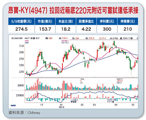 昂寶-KY(4947)是敦南旗下專攻電源管理晶片廠,也是全球少數能同時提供AC/DC、DC/AC晶片解決方案的IC設計公司,核心團隊來自美國半導體公司TI。產品以電源管理IC為主(佔九成以上),產品線包含PWM功率開關、QR控制器、PFC、PSR、二次測迴授IC、LED電源管理IC等。昂寶三月及第一季營收雙雙創下單月及單季歷史新高紀錄,主要是受惠智慧手機導入快充趨勢不變,昂寶第一季搭上陸系智慧手機的出貨旺季,帶動快充IC出貨,另外新品USB-PD也受惠筆電廠拉貨帶動,繳出淡季不淡的好成績。昂寶USB-PD晶片在價格上具備競爭優勢,加上該晶片導入MCU設計,因此順利打進中系及美系客戶供應鏈,昂寶手機終端客戶幾乎已囊括了中國大陸前十大智慧手機品牌廠,目前昂寶的快充晶片已通過聯發科、高通這兩大廠規格認證,並成功拿下手機品牌廠華為、OPPO訂單,成為昂寶未來獲利的主要動能。昂寶第二季除了快充IC訂單持續成長外,USB-PD晶片也因Type-C在智慧手機市場滲透率提升而受惠,尤其手機快充逐漸由高階機種向下延伸至中低階機種,導致需求快速攀升,預期第二季昂寶快充晶片出貨將優於預期;加上無線充電產品可望於本季備妥,今年成長動能值得期待。【操作建議】股價於四月二十七日見底後強彈,大格局則落在二二○至三二○元區間整理,由於季線反壓尚未克服,暫以箱型結構視之。
