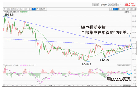 三大支撐匯集在一二九五美元附近萬一跌破一千三百美元整數關卡,等於宣告年線的一二九五美元支撐有失守的可能性,從周K線圖可發現,二○一一年的一九二○美元高點下跌以來的長期下降壓力線,目前正好落在一二九五美元附近。同時一一二三.九美元低點以來的中期上升趨勢線支撐,也正好落在一二九五美元附近。換句話說,一千三百美元整數關卡若守不住,暗示著三大支撐匯集的一二九五美元也終將被跌破,屆時多頭寄望的五年大底就不容易構築成功。