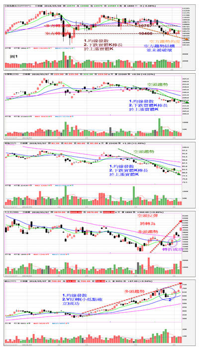 上周五(五月四日)的美國就業非農數據大好,讓原本台灣及美國股市欲振乏力的K棒結構得到了一個有力的反彈,也正因如此,空方奮力一擊的失敗後短線空頭力道受阻,使近期台股與美股會有一個相當程度的反彈,但真的從底部轉多了嗎?我們用戰鬥K線來看吧!一個從強勢多頭行情轉變為空頭,在下跌過程中常會出現碰支撐後產生反彈之現象,在此時會有一種做多賺不到、做空會被軋的無奈感。空頭趨勢被扭轉必要過高 無過高必有鬼多頭在此時的位階會想要儘快扭轉這個盤勢往上,所以當出現反彈行情必定要過之前的高點,否則不過高又往下壓持續發生,那就意味空頭趨勢即將展現實力!如何確認是反轉往上或是反彈小漲呢?關鍵就在K線結構內,在K線理論裡的K棒及均線會因為時間的關係而產生一個往右上(股價平均上漲)或是右下(股價平均下跌)的角度(如圖一所示)。目前台指日線均線結構為死亡排列且均線為發散狀態,在空方趨勢的解讀中以均線發散是最強的趨勢盤,只要股價無法站上中長均線之上是無法改變均線結構的,這個邏輯適用在所有指數商品(包含個股商品),所以目前結構只能視為反彈行情,並無多頭行情之跡象。台股強弱勢股明顯 須同步才能創造趨勢目前台股未能有明顯趨勢格局在於主流漲跌不一致,以蘋概為主軸的權值股就出現多空分歧的現象。列舉四檔股票:台積電(2330)、鴻海(2317)、大立光(3008)、國巨(2327),這四檔股票從戰鬥K線的多空結構就可以非常清楚看到各呈現一個弱勢盤跌與強勢過高的狀況,也就因為這樣多空互相抵消的影響,行情就不容易有一面倒的狀況,要有一個明顯的行情就必須集中向上或是向下的行情,才會有一個比較大波的趨勢產生,否則將繼續維持目前這樣輪動輪漲的個股漲跌,指數仍維持小漲小跌的走勢。