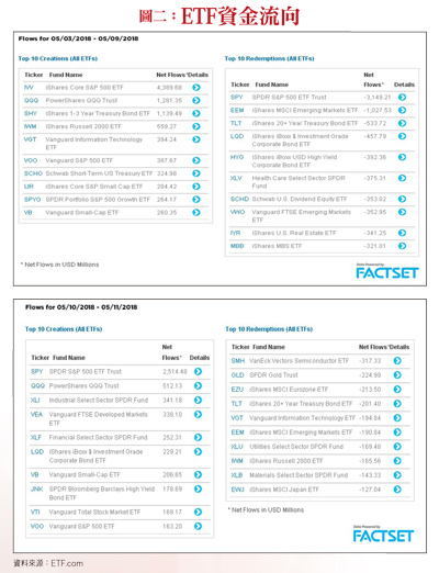 就近期美股觀察,可發現隨著市場情緒回升,資金風險偏好也開始提升,開始重新追逐科技股,帶動那斯達克及費半指數漲幅超越道瓊及標普五百指數,甚至還有領先創高的機會。觀察近一周(五月三日至五月九日)美國散戶情緒指數變化(圖一),在股神巴菲特釋出第一季仍加碼股票的訊息後,市場情緒又轉趨樂觀,看多股市者增加五.一%至三三.五%,但仍低於歷史均值逾五個百點,接下來仍有上升的空間。看中立及看空者則分別減少○.四%及四.七%,其中,中立觀望者仍超過歷史均值十個百分點,將成為未來的潛在買盤或賣壓。市場情緒復原 資金優先回補科技股隨著市場情緒恢復,資金風險偏好也跟著提升,同期間ETF市場資金開始回補股票及科技股(圖二),例如買超第一名的IVV為追蹤標普五百指數的ETF(雖賣超第一名的SPY也是追蹤標普五百,買超金額仍大於賣超金額)、買超第二名的QQQ為追蹤那斯達克一百指數的ETF、買超第五名的VGT為MSCI US Investable Market Information Technology 二五/五○指數的ETF。另在賣超排行方面,前五名中債券型ETF就占了三名,包含賣超第三名的TLT、第四名的LQD、第五名的HYG,顯示ETF市場資金有賣債轉股的情況。如前一周所預期,在市場情緒回升後,ETF資金再度回補股票型ETF,進而帶動美股連續漲升的反彈走勢。相信若市場情緒持續回升至歷史均值(再增加五個百分點),ETF市場資金回補股票動作將會延續,五月十日及十一日兩日就仍持續回補股票,買超第一名為SPY,第二名為QQQ。在中美貿易談判後,能否有個兩全其美的結果,將是ETF資金是否持續買超及美股再度挑戰高點的關鍵之一。電子重回台股盤面主流 矽晶圓有望接棒被動元件除了美股反攻行情由科技股領軍外,台股也有同樣的現象,被動元件強勢噴出,指標股國巨(2327)來到千元大關坐上股后寶座,同樣具有漲價題材的矽晶圓,也開始接棒上演噴出秀,加上台積電(2330)、大立光(3008)及鴻海(2317)等電子龍頭指標陸續轉強表態,吸引資金回頭追買電子股,重回盤面領漲主流類股。矽晶圓族群之所以可以啟動新一波攻擊行情,要歸功於全球矽晶圓第二大廠勝高(SUMCO)五月十日公布財報時,釋出產業能見度已經看到二○二一年的利多訊息。SUMCO表示在旺盛的半導體需求支撐下,提振各種尺寸的半導體矽晶圓需求持續強勁,其中十二吋產品需求持續高於供給、八吋以下(含八吋)產品也持續呈現供需緊繃狀態,報價調漲潮仍將持續。預估二○一八年十二吋矽晶圓價格將如預期回升約二○%(第四季價格將較二○一六年第四季高出四○%),二○一九年價格也會再向上調漲,甚至客戶為了確保所需的數量提早搶料,已開始針對二○二一年以後的契約進行協商。八吋因供應量增加有限,未來恐處於長期供需緊繃狀態,客戶對於採購八吋矽晶圓的危機感更勝於十二吋產品。六吋目前雖因供應不足情況顯現,價格同步回升,但中長期前景不明。