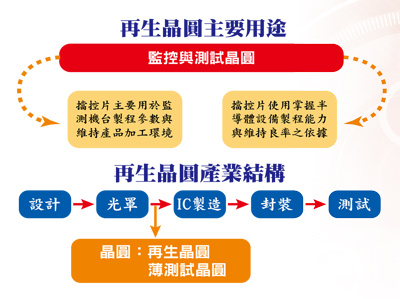 再生晶圓有望迎來比價行情再生晶圓並非製作IC時的不良品再生,而是在半導體IC製造過程中,將使用於製程監控(Monitor wafer)及檔片(Dummy wafer)用的晶圓,回收加工再使用,目的就是要降低測試用晶圓及檔片成本。由於再生晶圓相對於測試晶圓的成本優勢,有逐漸取代測試晶圓的趨勢。再生晶圓產業與晶圓投片量(Wafer Start)及晶圓代工廠產能利用率密切相關,晶圓製造廠建晶圓廠、投入新產線及製程調整皆需要再生晶圓作測試,再生晶圓需求同步成長。隨著整合元件製造商(IDM)大廠轉型至輕晶圓廠(Fab-lite)或無晶圓廠(Fabless)的營運模式,對先進晶圓代工廠的需求也日益增高,對再生晶圓需求也會同步成長,加上半導體廠持續增設新廠且不斷開發先進製程,需要大量的測試晶圓,對再生晶圓的需求也會大幅增加。尤其目前全球半導體在汽車自動駕駛、人工智慧、高速運算、物聯網、工業4.0等新興需求推升下,積極興建十二吋及八吋晶圓廠,可望帶動全球需求不停維持穩健成長。根據國際半導體設備材料產業協會(SEMI)調查預測,二○一六年全球再生晶圓市場規模為四.三一億美元,其中十二吋再生晶圓占七三.五%。SEMI預估至二○一八年市場規模將再成長至四.五四億美元。近年中國積極投資半導體市場,加上台灣多家半導體業者也通過申請赴中設廠,十二吋晶圓的產能將逐步放大。SEMI預估二○一九年中國在全球產能佔有率將由目前的一二%提升至一九%,中國卻缺少十二吋再生晶圓的技術與廠商,登陸的台灣半導體業者也傾向與過去長期配合的再生晶圓廠商維持合作關係,將為辛耘(3583)、中砂(1560)及昇陽半(8028)等國內再生晶圓廠提供長線成長動能。