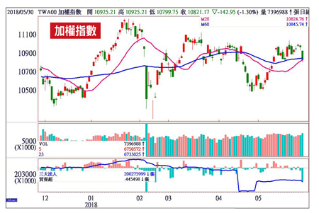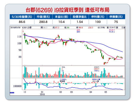 今年以來台股大致都和我們所規劃的差不多,過年前一一二五○點上下提醒追高風險,避開千點回檔,二月九日當天也告知一○一八九點為波段相對低檔,過年後會有一波融券回補的軋空行情。四月中在一○九六○點上下再度提醒大家,小心軋完空後反手殺多反映第一季財報利空。而當四月二十五日指數跌破年線看到一○四八九點時,又再度領先市場天天肯定告知,年線附近是買點非賣點,第一季財報利空出盡前後,就會打底完畢往上攻,如今指數果然又從一○四七八點漲到一一○○○點上下震盪,又幾乎完全驗證。所以目前對台股後市看法不變,現處於大三角收斂整理末端,但在i9新機六月開始啟動拉貨潮、蘋概股旺季到,以及今年景氣仍往上看,不僅六月十三日Fed升息一碼機率大,主計處也於日前調高台灣GDP到二.六%,最後就是下半年將慢慢進入原物料傳統旺季。六月十三日Fed升息前後,伴隨蘋概進入拉貨旺季,台股很有可能往上突破三角收斂整理,一一二七○點應不是今年高點。蘋概股拉貨旺季將到,所以績優超跌且i9比重高的蘋概股,拉回絕對是找買點,可波段搭配短線,待九月蘋果新機發表前後,才是蘋概股相對高檔獲利了結時。台郡(6269)為蘋果PCB軟板廠主要供應商之一,第一季受到產能利率下滑及台幣升值等因素影響,每股盈餘為○.八元,低於市場預期。不過,台郡財務長熊雅士表示,今年台郡各季度營運趨勢與往年差不多,第二季為主力客戶新舊機種交替期,預估第二季雖然為今年營運谷底,但生產及備貨數量仍將較去年同期成長一五%到二五%。