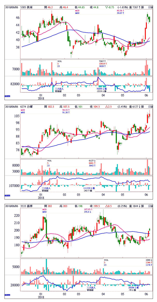 留意五月營收亮眼 低位階標的而高階材料多由國際大廠掌握,台廠有掌握到的如台燿(6274),於先前已跟日立化工簽約合作在高階材料生產的區塊,下半年即將投產,而去(二○一七)年因為訴訟問題而產生的費用,已經在去年第四季一次認列,影響了去年EPS約二元,所以就本業來說,其實去年EPS應有六元的水準,而非四元的情況,而今年在少了額外的費用加上下半年新產能的開出,難怪股價能維持強勢的多頭格局。最後再回頭來看大盤,加權指數衝上一萬一千點之後,過去的主流族群開始漲多回檔,取而代之的是五月營收有機會亮眼,股價還沒什麼漲,在低位階的股票表現,雖然還沒有明確的新主流,但低位階股票向上攻擊,也是不錯的多頭輪動方式,除了前文談到的個股或銅箔基板之外,底部型態不錯的還有如嘉澤(3533)以及二線光學股等等。
