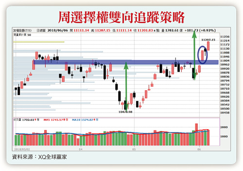 根據國際金融協會(IIF)數據顯示,海外資金五月份匯出約一二三億美元,創下二○一六年以來新高。美國與多國展開貿易戰,各國制裁關稅條款已蓄勢待發。而美元升值令新興市場債的違約風險提高,除了阿根廷和土耳其,印度、泰國、馬來西亞和印尼等國家,也陸續面臨美元計價的債券違約問題,都是造成資金外流的原因。美元兌台幣匯率從三十元快速回落至二十九.七三,扭轉之前一路貶勢。在外資回籠帶動下,台股順利站上一萬一千點,突破型態整理區。這次台股能有如此表現,來自於六月份股東會旺季營運展望與除息行情效應,為市場注入新的活力。金融股受惠聯準會升息,海外資產估值上升挹注獲利成為法人布局重點,順利接棒成為推升大盤主流族群。接著被動元件缺貨題材持續擴大,直到二○一九年仍是無解,也令個股表現強過大盤。台股在四日站上一萬一千點密集壓力區,形成多方突破的關鍵K線。從波的等幅來推算,前一波自低點反彈起點為一○四七八點,距離一萬一千點為五二二點。這一波突破起點從一○八○○點開始,推算目標區大約落在一萬一千三百點附近,距離前高一一二七○點亦不遠矣。配合籌碼布局來看,四日外資在台指期未平倉部位加碼至五萬五千多口,來到近期相對高檔。同日自營商的選擇權未平倉部位,Sell Call為二萬四千多口,Sell Put為五萬八千多口,呈現中性偏多布局。整體來看,技術面偏強,籌碼也呈現偏多布局,可利用溫漲(買權多頭價差)策略進行追蹤。
