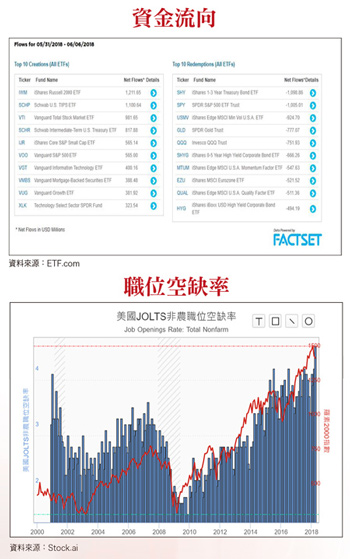 小型股貿易依存度低 貿易戰火傷害小推估前述現象可能原因,是美國貿易戰死灰復燃,歐洲、加拿大及墨西哥等也陸續以課徵關稅回敬美國,市場資金為了降低風險,開始轉進貿易依存度較低的羅素二千等小型股,加上內需型企業比重較高,美元走強後對出口營收所帶來的匯損衝擊相對較小,也成為羅素二千獲得近期資金青睞的理由之一。此外,羅素二千主要覆蓋作為美國就業職位增長動力的小型企業,指數表現與JOLTS 非農職位空缺率也存有高度相關性(見附圖),美國勞工部六月五日公佈職位空缺在四月底增至季節性調整的六七○萬人,超過失業人數的六三○萬人,而自二○○○年以來,工作空缺首度多於失業人數,顯示美國經濟強勁且影響雇主與勞工的行為,也提供資金追逐羅素二千很好的理由。在債券型ETF方面,則轉向買進中長天期債券ETF(例如買超第二名的SCHP(Schwab美國抗通膨債券ETF)及買超第四名SCHR(Schwab美國中期公債ETF)),賣出短天期債券ETF(例如賣超第一名的SHY(iShares一~三年期美國公債ETF)及賣超的第六名SHYG(iShares○~五年高收益公司債券ETF)。我們研判應是美國聯準會六月升息已成市場共識,但長期景氣又有疑慮,市場預期未來升息次數可能不會那麼頻繁,投資債券ETF的資金才會出現賣短買長的轉變。台股評價已高 回檔風險漸增考量ETF資金開始從外銷大型股(包含科技股)轉向內需小型股,短線已漲多的那斯達克及費城半導體指數將面臨不小的獲利賣壓。一旦美股科技股表現受到壓抑,對科技股比重高的台股來說,絕非是個好消息。事實上,目前台股評價上已不算便宜,潛在上檔報酬恐小於潛在下檔風險。根據凱基投顧最新報告分析,台股本淨比(PB)已來到一.七二倍,不僅高於過去五年平均水準的一.五六倍,也逼近過去五年最高峰的一.七三倍。若以凱基預估今年台股ROE約一一%,也接近二○一四~二○一五年蘋果iPhone6所創造出一一%的ROE,今年本淨比要超越當期的一.七三倍應不容易。