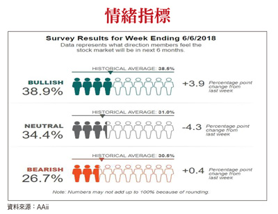 隨近期美元指數快速走強,熱錢從新興市場抽離動作轉趨積極,間接成為新興市場股市的賣壓。本月美國聯準會(FED)再升息一碼,泰國、韓國、澳洲、紐西蘭及台灣等亞太地區五大經濟體的利率,已與聯準會發生利率倒掛的情況,恐進一步增加資金回流美國的誘因,加大外資對台股的潛在賣壓,投資人操作不宜過度積極,甚至可逐步將持股調整至進可攻、退可守的低基期高殖利率股。資金偏好轉變中 操作前停看聽近一周(五月三一日至六月六日)美國散戶情緒指數(見附圖),隨著義大利地緣政治風險降低,情緒又轉趨樂觀,看多者增加三.九個百分點至三八.九%,略高於歷史均值的三八.五%,尚未過度樂觀。中立者則減少三.三個百分點降至三四.四%,看空者小增○.四個百分點至二六.七%。由於川普拒絕簽署G7公布,並揚言要課徵汽車進口稅,貿易戰火似乎又將重新燃起,對投資人信心將帶來一定的負面衝擊,可能會讓市場情緒暫時轉為保守。但考量目前全球經濟數據尚未惡化,美國更是相對亮眼,故在短期利空衝擊淡化後,美股仍有機會挑戰高點。同期間ETF市場資金流向(見附圖),可發現市場資金偏好已出現明顯的變化,若影響因子未反轉,相信資金移動情況將持續一陣子。首先在股票型ETF方面,資金開始轉向買進中小型股ETF(例如買超第一名的IWM(iShares羅素二千ETF)及第五名的IJR(iShares核心標普小型股指數ETF)都是在追蹤美國小型股),賣出大型股ETF(例如賣超第二名的SPY(SPDR標普五百指數ETF)及第五名的QQQ(Invesco納斯達克一百指數ETF)都是追蹤市值較大的個股)。