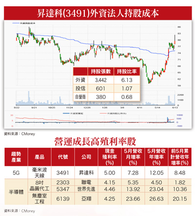 正因短線台股回檔風險漸增,投資人勢必要轉為謹慎一些,持股比重高者需先減碼因應,尤其是股價正乖離過大的被動元件、MOSFET等族群,並可同時將部份持股轉換成具下檔保護的低基期高殖利率個股,較能展現進可攻、退可守的防禦性功能。在我們看好的趨勢產業中,符合現金殖利率四%及五月營收年增率大於累計前五月營收年增率(表示營收動能持續增加)的個股有晶圓代工廠聯電(2303)、世界(5347)、無塵室工程廠亞翔(6139)及微波高頻元件廠昇達科(3491)。