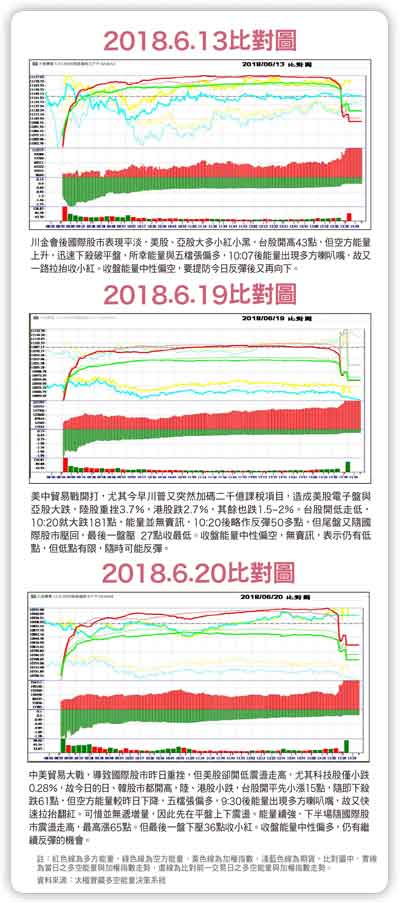 六月十九日,美中貿易戰開打,尤其川普又突然加碼二千億課稅項目,造成美股電子盤與亞股大跌,陸股重挫三.七%,港股跌二.七%,其餘也跌一.五~二%。台股開低走低,十點二十分就大跌一八一點,能量並無賣訊,十點二十分後略作反彈五十多點,但尾盤又隨國際股市壓回,最後一盤壓二十七點收最低。收盤能量中性偏空,無賣訊,表示仍有低點,但低點有限,隨時可能反彈。中美貿易大戰,導致國際股市十九日重挫,但美股卻開低震盪走高,尤其科技股僅小跌○.二八%,故六月二十日的日、韓股市都開高,陸、港股小跌,台股開平先小漲十五點,隨即下殺跌六十一點,但空方能量較前一天下降,五檔張偏多,九點三十分後能量出現多方喇叭嘴,故又快速拉抬翻紅。可惜並無遞增量,因此先在平盤上下震盪。能量續強,下半場隨國際股市震盪走高,最高漲六十五點,但最後一盤下壓三十六點收小紅。收盤能量中性偏多,仍有繼續反彈的機會。本周為雙重時間轉折,六月二十日盤中低點,下探到半年線與年線之間,隨即拉抬收紅,且六月二十日為一○二六一點下跌第八天時間轉折,不排除見波段低點,轉折向上。但仍須未來一至三天確認,只要能量維持偏多,甚至出現買訊,就有機會挑戰一一二七○高點。然而,也必須提防若能量遲遲不見買訊,而貿易戰越打越兇,則反彈後就可能下探年線。