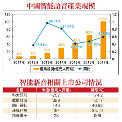 中國智能語音產業二○一七年的規模在一百億人民幣左右。自二○一一年算起,年均複合增長率五八%,遠高於全球市場的增長。中國現階段佔據全球六分之一的市場。在A股市場上,涉及智能語音的企業有五家,分別是科大訊飛(002230)、歌爾股份(002241)、漢威科技(300007)、精倫電子(600355)和四川長虹(600839)。其中,科大訊飛是該領域龍頭企業,佔據國內七○%市場份額。從產業規模的絕對數來看,該行業處於方興未艾的階段。相對於動輒數百億的市值,一百億的市場規模顯得相對較小,造成的結果是相關公司的PE估值較高,其中龍頭公司科大訊飛的PE為一七四.三。智能語音行業要出現爆發式的增長,還需要解決技術和應用場景的問題。技術發展狀況智能語音市場的發展受到技術發展的限制,基礎語音技術、智能化技術和大數據技術是智能語音的核心部分。自二○一○年微軟將深度學習引入到了語音識別領域,經過這幾年的發展,基礎語音技術已經成熟。現階段技術的難點主要在智能化語音技術,以實現多輪化和個性化聊天。實現這些智能功能的關鍵前提是建立龐大的語音數據庫。哪家公司能夠掌握客戶的信息流,就佔據了行業發展的高地。
