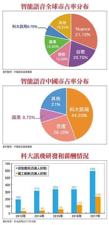 為爭奪的是音響背後的用戶、數據以及服務入口,亞馬遜公司二○一四年選擇推出智能音響Echo這一載體來實現這些目的。而中國龍頭科大訊飛二○一五年發布了智能音響叮咚,二○一六年谷歌發布智能音響Google Home。從市場的反應看,Echo銷量二○一七年成功突破千萬,但科大訊飛的叮咚音響則銷售慘澹。主要是因為歐美超過八五%家庭擁有家庭音響,而這一數據在中國不足二○%,群眾基礎不一樣。我們認為,相對於智能音響,智能汽車和智能家居應該是中國公司尋求突破的重點領域。產業格局與前景中國的語音市場主要被三家公司佔據,科大訊飛、百度和蘋果。根據二○一五年的數據,三家公司的市場份額加起來為七九%。從技術層面看,中國智能語音企業的技術水平相比國外同行並不遜色,在大數據庫搭建、實驗布局等方面處於世界領先水平。從目前中國的行業格局看,科大訊飛、百度等基本將主要的精力用在技術集成大平台和生態圈的建設,以用來搶佔未來人工智能和物聯網的入口。一些中小型的公司則致力於生產消費級的實物產品,如云知聲的車載智能後視鏡、出門問問的智能語音手錶、思必馳的智能車載語音語音系統等。從科大訊飛二○一七年的年報看,全年營收五四.四五億,增長六三.九七%。在營收大幅增長的情況下,淨利潤也出現負增長(四.三五億,衰退一○.二七%)。主要是現在處於人工智能戰略機會空窗期,公司需要持續的大量投入到研發和人工智能開放平台生態系統的構建上。從公司的研發費用看,二○一七年大幅增加二.五九億,增幅為七六.八%,職工薪酬增加一.一五億,增幅為九六%,可見公司對於技術和人才的重視。截至二○一七年底,訊飛開放平台合作夥伴達到了五一.八萬,應用總數達到四十萬,平台總用戶數(終端設備數)達到一七.六億。