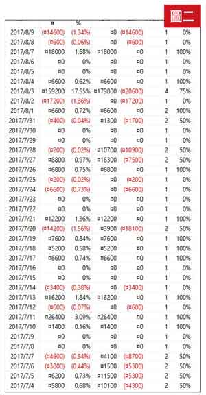 回到上週說的程式交易最重要的壓力測試,即遇到重大事件或突發狀況的耐震測試(如同金融業的壓力測試),在理論上,AI程式交易是不應該加入人為判斷暫停或變更交易的,因為人工智慧深度學習的結果與人為干預會相牴觸的,但在實務上,程式開發者為求更好績效或未能克服某些程式問題,仍會出現人為干預進而績效失真。記得二○一八年二月六日台股大跌六四六點,期交所交易出現了台股史上最嚴重的選擇權超額平倉損失,至今仍未順利解決。二○一七年八月三日台指期會開盤閃跌一千點,前所未見,當然也是幾家歡樂幾家愁。接連出現類似黑天鵝事件的時候,程式的表現應對如果是出現重大損失,就會嚴重影響績效,或強制平倉的話,後續就沒辦法交易了,所以我們需要誠實的檢視程式歷年來面對重大事件的表現如何。如圖一,二○一七年八月三日閃跌一千點,我們的程式表現是前一天空單,當天停利再空,當天總獲利七九六點/口。又如圖二,二○一八年二月六日大跌六四六點,當月小賠七十三點。一般程式對於大大小小行情的掌握程度大都不錯,但遇到多次突發事件的時候是大賺小賠的話,才是真的穩定好程式,若是不能有效處理突發狀況的話,就好比人為主觀交易常犯的毛病小賺小賠大賠,最終績效平平,甚至還賠錢呢!對於這個重要的耐震測試,我個人感到滿意,您覺得呢?再來要說的就是追求更真實的程式交易,為什麼不說更好的程式績效呢?因為更好的績效是很容易針對個別商品製作出來的,這也是很多人選用程式交易後不如預期報表的結果,那要怎麼分辨程式呢?進而有更好的績效呢?下週來作完整的說明,千萬不要錯過喔!