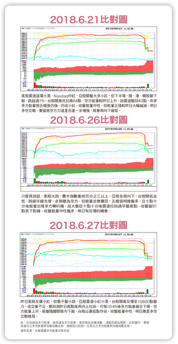 上周為周線雙重時間轉折,上周三本欄截稿日(六月二十日)盤中跌破半年線後,隨即拉抬收紅,我在本欄已說明:只要能量維持偏多,甚至出現買訊,就有機會挑戰一一二七○高點。然而,也必須提防若能量遲遲不見買訊,而貿易戰越打越兇,則反彈後就可能下探年線。上周四(六月二十一日)美股震盪,道瓊小黑,Nasdaq中紅,亞股開盤大多小紅,但下半場,陸、港、韓股都下殺,跌超過一%。台股開高先拉高六十四點,高點反彈到一○九九二點,空方能量較前一天上升,故震盪壓回四十三點,所幸多方能量與五檔張仍強,仍收小紅。收盤能量中性,仍未見買訊,且能量正值較前一天大幅縮減,表示反彈無力,只要空方力道進一步增強,就會再向下破低。上周五(六月二十二日)台股直接跳空下跌,盤中大跌一一三點,破周三低點,收盤留七十一點長下影線,收小黑十字線。表示次日為能否止跌的關鍵,剛好又是台積電除息,將影響台股除權息行情。本周一(六月二十五日)台積電除息六十九點,國際股市小紅小黑,台股開低向下,台積電還小幅貼息,中盤橫向震盪,尾盤美股電子盤與陸股、港股下殺,台股跟著殺尾盤,以最低點下跌一一二點作收,扣掉息值仍下跌四十三點。六月二十五日晚間川普再放話,美股大跌,費半指數重挫三%以上。六月二十六日亞股全面向下,台股開低走低,跌破年線支撐。走勢雖為空方,但能量並無賣訊,五檔張明確偏多,且十點十分後能量出現多方喇叭嘴。故大盤從十點十分後震盪拉抬過早盤高點,收盤留九十一點長下影線。收盤能量中性偏多,次日有反彈的機會。但一○八○○點已成短線壓力,故我在FB建議反彈到一○八○○點附近,應站在賣方。六月二十六日美股反彈小紅,但電子盤小跌,六月二十七日亞股震盪小紅小黑,台股開高剛好反彈至一○八○○點壓力,成交量不足,壓回測前一天高點後再向上拉抬。可惜十點四十五分後多方能量緩步下降,空方能量上升,尾盤隨國際股市下殺,台股以最低點作收。收盤能量中性,隔日應是多空交戰格局。由川普挑起的貿易大戰似乎越演越烈,台股也果如上周本欄所言下探年線。當然,若加上息值,還差三十點才到年線。目前空方趨勢尚未扭轉,但能量也沒有賣訊。因此,不可急於承接,也不宜向下追殺,先短進短出,或觀望。七月六日為貿易大戰是否成真的關鍵日。在此之前行情都會隨消息面起舞。大盤趨勢既然偏空,那麼在能量沒有見到買訊之前,反彈到壓力都應該站在賣方。