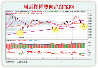 這週的國際股市跟這一屆的世界盃強豪隊伍們的表現一樣,只能用軟趴趴來形容。在美國科技股跟進補跌之後,全球股市再度進入一輪修正。原因自然還是因為貿易戰,川普宣布限制海外資金投資美國科技企業後,FANNG率先帶頭下跌,NASDAQ在六月二十五日當天跌幅達二%,費城半導體更高達三%,美股四大指數中表現最弱的道瓊指數則是直接回測年線。將較於國際股市的保守氛圍,台灣主計處上調今年經濟成長率到二.六%,財政部統計的出口訂單也是歷年最高,從台灣的基本面來看,確實經濟還在擴張。但股市弱勢的事實卻擺在眼前,要知道股市是實體經濟的領先指標,現在股市的修正,反映的正是國際貿易戰對未來實體經濟的影響。從技術面來分析,如今台股回測年線,短線趨勢轉為弱勢修正,長線投資的低接買盤和政府基金,必然會有所動作。但是半年之內就回測三次年線,買盤的壓力也會很大,市場要能重回上升趨勢,根源的全球貿易戰就必須要有個明朗結果。從籌碼面來觀察,外資的台指期未平倉淨多單下降至二萬八千多口的水平,在這一週的時間內,減碼了一萬多口,代表外資態度偏向保守。同日自營商的選擇權未平倉部位,Sell Call為三萬二千多口,Buy Put為一千多口,顯然現在自營商也明確保守立場,不再像過去總是中性搖擺。整體來看,籌碼維持保守立場,指數回測年線技術面也同步走弱,可利用溫跌(賣權空頭價差)策略來避險。