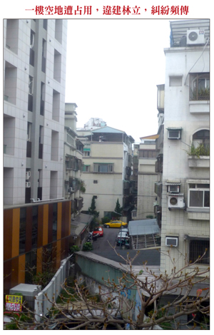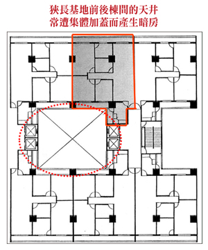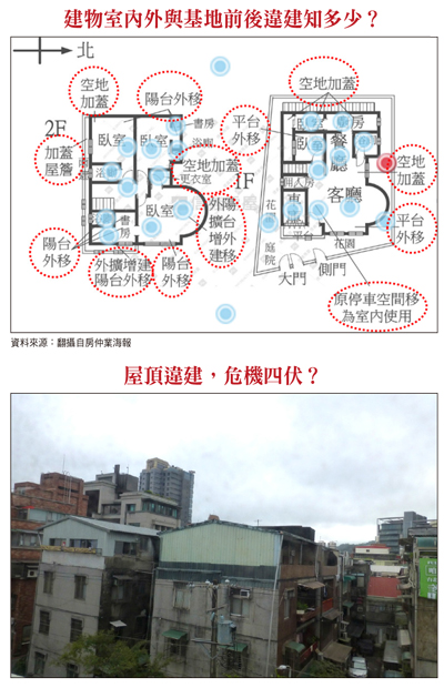 二、後院違建另外,不僅是前院遭非法占用,後院更常遭忽略,試想只有三公尺寬的防火巷,如果一樓出租開設餐廳,最常見到放置瓦斯桶或當作雜物、垃圾放置空間,不僅蚊蠅孳生,老鼠、蟑螂更是不在話下,除嚴重影響居家品質之外,一旦發生火災,後果更是不堪設想。目前一般最常見的是占用防火巷,並將廚房、廁所外移,以增加室內使用空間,時下常見一樓占用前後院空地,甚至擅將側面空地部分加蓋,以增加營業空間,此一情況即使是東區巷道亦是隨處可見,雖然政府一再宣示拆除決心,違建依舊有增無減,說穿了還不是利之所趨有以致之。三、地下室違建光是一樓的違建就不計其數,近年違建更從一樓蔓延至地下,如同不久前議論一時的「蟻居豪宅」也是違建奇觀之一。此外,也有一樓屋主將部分地板拆除,並加裝樓梯以與地下室聯通,形成樓中樓的另一種居家型態,或是索性將出入口封閉,將全體大樓共有的地下空間據為己有,再經隔間裝潢後出租,更有將地下室空間計入銷售坪數而以「使用面積」計算出售。不過,依照建築法相關法令規定,對於屋主擅自拆除樓板做為樓梯通往地下室,可處六萬至三十萬元不等的罰鍰,直到改善完成或是補辦手續為止,因此,購屋前務必小心謹慎,避免落入陷阱,白忙一場。四、陽台外推從建築物外觀即可輕易了解是否有陽台外推情事,一般常見老舊公寓陽台外推,並將原有牆壁拆除,以增加使用空間,另外,亦有加裝花格鋁窗,再將使用空間向外延伸,有關這些問題,通常在預售屋平面設計圖上都會以虛線加以標示,不過還是無法改變違建的事實,只是未經舉報拆除而已。