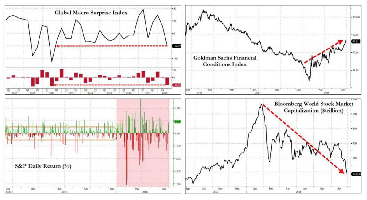美元的強勢對於全球金融市場來說是場流動性的大災難,在FED結束QE至今已經升息六次,今年預估在九月跟十二月都可能再各升息一次,預估到今年結束時美國的聯邦基準利率區間將會來到二.五~二.七五%,與此同時FED的縮表以及發債回收美元的動作將會持續,這對全球的資產價格將造成不小的影響,畢竟所有的資產價格都只是貨幣現象,在過去寬鬆的時候增加上漲,而現在緊縮的時候下跌,都只是貨幣數量的多寡造成的表面現象。超寬鬆日本也搞緊縮從全球重要央行明、後年的利率決策風向的預估來觀察,幾乎大部分央行都是偏向升息,也就是說明年以後全球升息收緊資金的力道會比今年有過之而無不及,甚至過去全球最寬鬆的日本央行,也在六月份連下三道資金緊箍咒要開始退出寬鬆的政策,分別是六月一日宣布縮減五至十年期債券的購買金額每月二百億、六月十四日縮減三至五年期國債購買規模每月三百億,以及六月二十九日再次縮減五至十年期債券購買金額每月二百億,再加上歐央今年底將全面退出量化寬鬆,雖然都沒有談到何時升息,但可以知道全球主要央行緊縮流動性是共同的目標。客觀統計數據提醒風險另外,從高盛的全球金融狀況指數來觀察,不難發現全球金融市場日益出現緊縮,也造成今年以來到目前為止,全球股市的股本已經蒸發了一兆美元,從股本的角度來說全球已經進入到空頭熊市回調修正的環境,只是投資人受到某些市場特定關注的大股票強勢的影響,認為這只是牛市回調修正。
