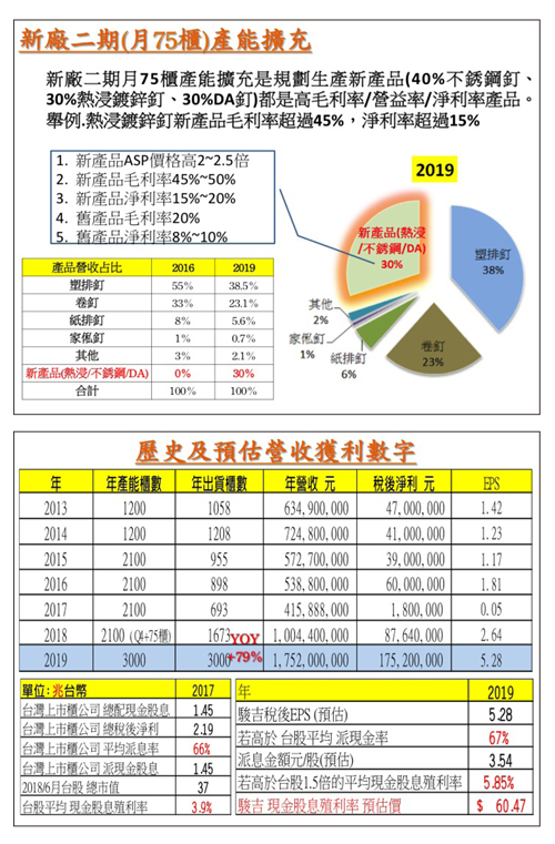 外銷美國雙反稅率降到一.○三% 低稅率優勢讓公司訂單應接不暇今年二月七日起駿吉一.○三%的低稅負優勢,開始反映在公司的月營收YOY增長幅度上面。二月營收YOY+36.5%、三月營收YOY+54.1%、四月營收YOY+63%、五月營收YOY+75.5%...預計七月起公司單月營收YOY可以出現+100%,且持續到年底幾乎是毫無懸念的事。而去年第四季高價買進的盤元也在今年四月消化完畢,伴隨著第二季月營收YOY都超過五○%以上增長,預計今年第二季單季稅後EPS應該能有○.五元以上水準(去年第二季單季EPS為負○.○八六元)。而北美客戶發出公司能產出多少櫃就拉貨多少櫃訂單無慮的情況下,駿吉預計今年七月就能創下單月歷史新高的一四○~一四五櫃產量數,隨著產能利用率持續提升到第三季底兩廠合計月一七五櫃應能達到滿載。所以可預期的今年第三季、第四季單季稅後EPS能呈現一季高於一季。同業焦頭爛額裁員減產 駿吉好整以暇持續擴產駿吉目前月產量一七五櫃(一廠月一百櫃、二廠月七五櫃),今年第四季公司預計在二廠進行產能擴充,總月產量逐步增加至一五○櫃(原為月七十五櫃),這將使公司兩工廠之年總產能由原來之二一○○櫃提高為三千櫃,增幅達四三%。同時二廠二期七十五櫃的新產能規劃生產熱浸鍍鋅釘、不銹鋼釘、DA釘等毛利率為現有產品二倍的新產品。此等新產品二○一九年營收佔比可達三○%。產品線齊全後,就可滿足客戶一站式購足(one stop shopping )的需求。