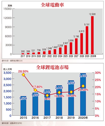 根據國際能源署(EIA)所發布市場調查統計報告指出,截至去(二○一七)年為止,全球電動車市場已達三百萬輛以上。其中,中國電動車數量占全球市場比重最高,總數高達一二○萬輛。國際能源署與摩根大通 看好全球電動車後市EIA進一步預測指出,二○三○年前,全球電動車數量將持續成長達一.二五億輛。如進一步以更樂觀展望推估,屆時全球電動車總數將達整體包含內燃機汽車在內的全球車市三○%左右比重,上路運行的電動車總量將大幅成長達二.二億輛。同時,日前全球知名大型投行摩根大通,發布《全球汽車行業研究報告》預估指出,二○二五年全球電動汽車普及率,預計將達七.七%,總銷量將達三三六○萬輛;二○二○年、二○二五年,中國電動車銷量占比全球總銷量,將分別達五九%、五五%。全球電動車市,在中國、英國、法國、德國、挪威、荷蘭、印度等國相繼宣布禁售燃油車施行時間表下,不難預見持續成長的推升力道,未來只會日趨增強,因此有利電動車相關零組件台廠供應鏈後市營運。現階段正全力發展電動車產業的中國,已經出現全球市場舉足輕重的鋰電池大廠。全球銷量最大鋰電池廠 寧德時代搶下BMW電池訂單近日德國豪華汽車廠寶馬(BMW)證實,已經與中國鋰電池大廠寧德時代,簽訂總價值逾十一.六億美元電池供應合作協定。雙方於七月九日所舉行柏林峰會中,正式簽定合作契約,中國國務院總理李克強出席此項儀式,充分彰顯此次中德合作對寧德時代的重要性。成功拿下BWM鋰電池訂單後,寧德時代將於德國圖林根聯邦州,投資興建鋰電池製造廠。寧德時代目前正與當地政府持續溝通,確定各項相關建廠事宜。寧德時代與BMW合作計畫,最早於二○一二年即已展開,雙方曾共同開發「之諾1E」動力電池產品,而寧德時代二○一七年鋰電池總銷量多達11.85GWh,成為全球鋰電池供應龍頭廠。