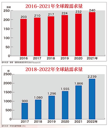 同時,中國本土大型品牌汽車廠─北京汽車(北汽),亦已宣布將於二○二五年,在中國境內全面停止生產、銷售傳統燃油車輛之後,已形同對目前全(去)年總銷量已達五十萬輛以上的中國電動車市,以及全球電動車市場,強力點火新一波刺激成長動能,也進一步觸發造車製程中,上游重要原物料金屬全球市場,因缺貨、市場預期漲價心理推波助瀾之下,金屬報價的持續上漲走揚。知名大型外資機構─高盛(Goldman Sachs)最新公布市場研究報告指出,全球電動車市的持續成長,不僅將使得全球電動車市規模將於二○二五年底,大幅成長達二一五○億美元以外,亦將連動拉高對製程上游原物料金屬的消耗需求。全球電動車熱潮方興未艾 台廠供應鏈吹響反攻號角預估於全球電動車產業持續成長背景帶動下,至二○二一年底,全球對於用以製造鋰電池的重要上游正極材料關鍵成分之一的鎳,市場拉貨需求量將因此擴增達二四○萬噸。另一項鋰電池正極材料關鍵成分鈷,預估至二○二二年時,全球需求數量也將大幅成長達二二三九噸。