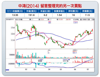 如果後續川普還有第二波更大報復行動,此機率目前看來可能較高!因目前看來美中貿易戰愈打愈烈,川普民調愈來愈高,有利十一月六日共和黨的期中選舉。如此則台股反彈至年線至月線間,之後再往下跌一段。後續如果還有第二波的話,對台灣很多電子業很可能將衝擊最大,到時候就得提防許多電子股短線反彈完之後多殺多下去!中鴻(2014):市場大多數人擔心美國貿易擴張法「232條款」對鋁鋼課關稅而受害,其實它反而是受惠股。因開採頁岩油用高毛利API鋼管,南韓向美妥協一年減三成銷量,因而轉單中鴻。加上國際原油價格目前處於近三年半來高檔,所以關稅部分由美商自行吸收,目前外銷部分訂單已經爆單。中鴻六月合併營收四一.九九億元,年增四四.八二%,第二季每股獲利與第一季○.五一元差不多,上半年EPS估一元以上。日前已宣布調漲七月內銷盤價,第三季營運可望淡季不淡。加上第四季為傳統旺季,今年原估每股可賺二元左右,很有機會再上修至二.三元左右。加上外資雖然已經大賣台股逾二千七百億元,但從五月中開始,即幾乎天天買超中鴻,買超逾七萬張以上,因此可留意整理完的另一次上車機會!