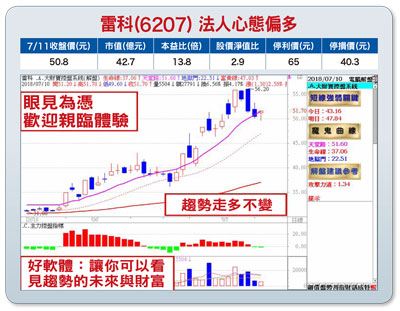 雖然中美貿易紛爭未歇、除權息行情不彰、虛擬貨幣價格下跌、中國手機需求趨緩,加上市場對新款iPhone期待度降低,外資一路賣不停等負面因素,仍將持續壓抑市場買氣,不過,在經濟基本面有力支撐以及內資力挺偏多不變下,具轉機成長題材的好股仍可望維繫輪動輪漲姿態。近期相對有利條件為:(1)上半年出口亮眼,財政部公布六月出口金額為歷年同月新高,扣除二月春節因素已連續二十個月正成長,第二季出口金額創歷年單季次高,連八季正成長,累計上半年出口金額創歷年同期新高。(2)美國超級財報季登場,可望照亮台系供應鏈,由金融族群揭開序幕,預期微軟、Google、德儀及蘋果等四大廠第二季財報也將優於預期,與四大廠連動關係密切的台廠供應鏈也可望有表現機會,至七月底預計約有三百家S&P 500企業將公布財報及營運展望,也將牽動美台股市表現。(3)第二季新台幣大貶四.七三%,上市櫃公司匯兌利益可望達數百億,為營運注入強心針。(4)股后國巨六月營收再攻頂,以八○.五四億元連續第四個月飆歷史新高,年增二二七.七%,累計第二季合併營收一九二.四四億元,同飆歷史新高,並較去年同期勁揚一五九.四%,累計前五月EPS已達二九.五三元,表現優於預期。聯電六月營收一三三.六四億元,為八個月來新高,第二季創六季度來新高。世界先進六月營收二四.九四億元,續創單月歷史新高,第二季更改寫季度新高。顯示儘管上半年智慧型手機晶片需求疲弱,隨著人工智慧、車用電子、物聯網等相關晶片需求轉強,加上MOSFET等功率半導體供不應求,帶動晶圓代工晶片投片量明顯回升,下半年進入智慧型手機生產鏈旺季,預期整體半導體產業第三季營運審慎樂觀、回升成長可期。美中貿易紛爭未除,加上目前月線及季線等於上檔仍呈現蓋頭反壓,在均線未扭轉向上之前,仍有下殺再探底風險。不過在經濟基本面有力支撐下,只要整體經濟能夠維持穩步向上走勢,縱有拉回下檔空間也不大,最重要的還是在個股。【個股推薦】雷科(6207)為台灣最大被動元件上游紙帶包材供應商。主要利基題材有:(1)二○一七年獲利達二.二八億元,年增三四.一%,EPS二.七四元,近七年最佳,每股配發現金股利一.八元,以七月十日收盤價五一.七元計,現金殖利率約三.五%。(2)被動元件市況火熱,大廠積極擴產,推升上游設備和材料廠雷科接單出貨大好,加上晶片電阻廠自去年下半年起開始汰舊換新生產線設備,對機器設備需求大增,繼五月合併營收達二.二九億元,月增九四.八六%,年增四六.四四%,六月合併營收達二.八三億元,月增二三.六二%,年增四五.六七%,公司自結五月稅後純益四千九百萬元,年增三○八%,EPS○.五九元,年增三二一%,並賺贏首季每股○.四三元。受惠被動元件相關產品持續緊缺,加上客戶端新增產能陸續到位,以及機台設備訂單拉長到年底,業績成長爆發力強勁。因機器設備毛利一向較佳,隨著國巨、奇力新旗下晶片電阻廠旺詮、中國大陸電阻廠風華高和厚聲等擴產動作積極,以及毛利率和獲利率同步轉佳,業績逐季成長可期,預估全年EPS有上看逾三元再攀新高的實力。(※基本面資料若有異動,依公開資訊觀測站最新訊息為主)。【操作建議】低接不追高,守穩前低四○.三元關卡不破,逢拉回量縮於富貴線及天堂路之間仍可留意,配合趨勢走多不變,一旦控盤指標及攻擊力道可雙雙翻紅轉強,後市仍將有續漲機會,設好停損停利(詳見附圖說明)。