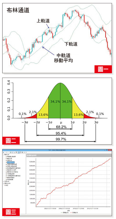 九百點以一口大台來計算,就是十八萬台幣的獲利,也許有人嫌少,有人說別的方法賺更多,但其實重點是長期穩不穩定,穩定你才敢真正實際交易。布林通道是很常用的一種技術指標,Bollinger Bands,又稱為布林軌道、布林帶、保力加通道、包寧傑帶等等。我們將布林通道的原理,寫成程式來做自動交易,得到長期穩定獲利的績效,可見這種技術指標能夠風行這麼多年,這麼廣泛的被使用,確實有它的特別優勢。若您不會寫程式也沒有關係,直接拿現成又被驗證過的程式來替你操盤即可。 布林通道如同其他的技術指標,都要根據不同的商品特性,來做最佳化,例如將布林通道用在台指期、恆生指數、小道瓊、輕原油等,都有不同的參數組。透過對該種商品做最佳化的過程,產生一組參數後,才能專對該商品得到真正穩定獲利的一套策略程式。以下我們就先說明布林通道的原理,再看短中長期的績效。※布林通道的原理布林通道主要由三條線所構成,由上而下依序為上軌道(壓力線)、中軌道(20MA移動平均線)與下軌道(支撐線)(圖一)。上軌道=中軌道+2個標準差中軌道=20期移動平均線(即20MA)下軌道=中軌道-2個標準差布林通道的概念,來自於創作者觀察美國股市的上下起伏,符合常態分佈的行為(圖二),若以二十期移動平均線作為中線,上下兩個標準差±2σ(sigma)會涵蓋九五%的股價範圍,所以布林通道原始的想法,當股價漲到接近+2σ上軌道,就容易回檔,可以考慮做空,當股價跌到接近-2σ下軌道,就容易反彈,可以考慮做多。用這樣的原始想法,套入台指期二十年大數據的最佳化過程,發現必須做一些調整才能得到好的績效,例如標準差並不是剛好二倍,我們的上軌道不到2σ,而下軌道超過2σ。更大的差異是,當股價接觸上軌道時,反而是要做多,接觸下軌道時做空,也就是去追高追低,與原始定義相反,才能在台指期得到最好的績效。