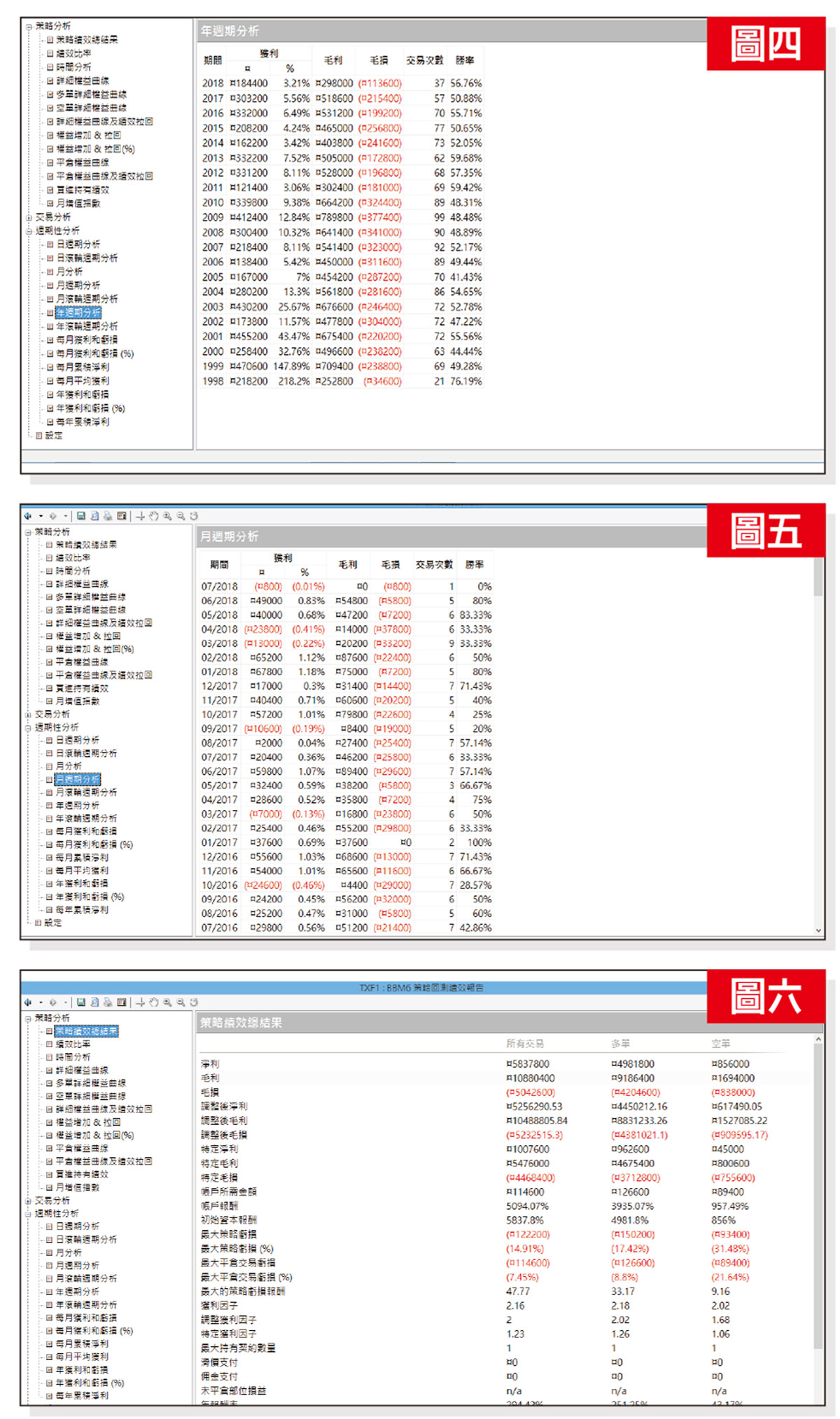 ※布林通道的績效用這樣最佳化後的策略程式來操作台指期,圖三是從一九九八年到現在,共二十年來的績效走勢圖,堪稱是相當平穩的往上。圖四是以一口大台來計算,這二十年每年所得到的台幣獲利數字,每年都有六位數以上。也就是說這支策略,二十年來不管歷經多頭市場、空頭市場,還是盤整期,都能達到一個獲利水準。如果再細看到以月份的統計,如圖五,就有一些月份是賠錢的紅字,這是很正常的,不可能每個月每筆交易都賺錢,重點在風險控管,程式交易的好處之一就是可以嚴格執行停損,而且這個停損值,是二十年大數據運算出的最佳值,多與空不同的停損值,可以得到最小損失,換取最大獲利。圖四至圖六圖六是總績效表,可以看出二十年的總獲利是五八○多萬,當然有人會說,回測歷史數據所得到的績效,不代表真正實際上線的績效。事實上這支策略程式是在去年第四季調整完的,到現在將近三個季度,實戰表現大致如同原本預料的走勢。一般來說通道型的指標,對於盤勢有過濾的功能,容忍度比較高,例如假突破、騙線、誘多誘空等型態,比較不會隨之起舞,而能比較順應到趨勢的發展,總而言之就是比較穩定,我們也期待布林通道的策略程式,在未來繼續延伸穩定優良的績效表現。有興趣的話,歡迎一起來驗證。
