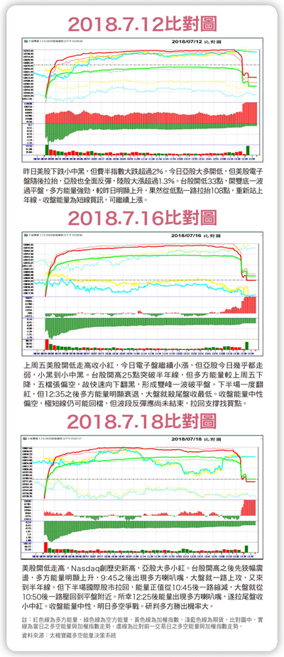 七月十七日美股小紅小黑,亞股漲跌互見,日股上漲,韓股小紅小黑,陸股、港股則大跌超過一.三%。台股開一低破低盤,向下回補七月十三日多方缺口,多方能量積極,五檔張偏多,故部分回補缺口後,向上反彈留二十點下影線收小黑。收盤能量中性,多空交戰。波段而言,回測缺口支撐應是買點。七月十八日美股開低走高,Nasdaq創歷史新高,亞股大多小紅。台股開高之後先狹幅震盪,多方能量明顯上升,九點四十五分之後出現多方喇叭嘴,大盤就一路上攻,又來到半年線。但下半場國際股市拉回,能量正值從十點四十五分後一路縮減,大盤就從十點五十分後一路壓回到平盤附近。所幸十二點二十五分後能量出現多方喇叭嘴,遂拉尾盤收小中紅。收盤能量中性,隔天多空爭戰,研判多方勝出機率大。近期消息面紛紛擾擾,尤其在川普到處放話、點火之下,市場不安定氣氛頗濃。但從能量角度觀察,不論有任何利空,或者國際股市大跌,始終沒有見到明確賣訊。七月六日殺到一○五二三低點當天,能量竟然還出現買訊,而大盤也從一○五二三低點反彈到一○八九○點,上漲了三六七點,若加上除息點數,更是等於大漲四七二點,日線也出現頭肩底型態,因此大盤應有繼續朝一一○○○點以上挑戰的機會。只是個股差異頗大,近期被動元件明顯走弱,而沉寂許久的蘋概股,例如台郡(6269)、可成(2474)、臻鼎-KY(4958)…等,都連續強勢上攻。因此選股應偏向低基期的轉機成長股。