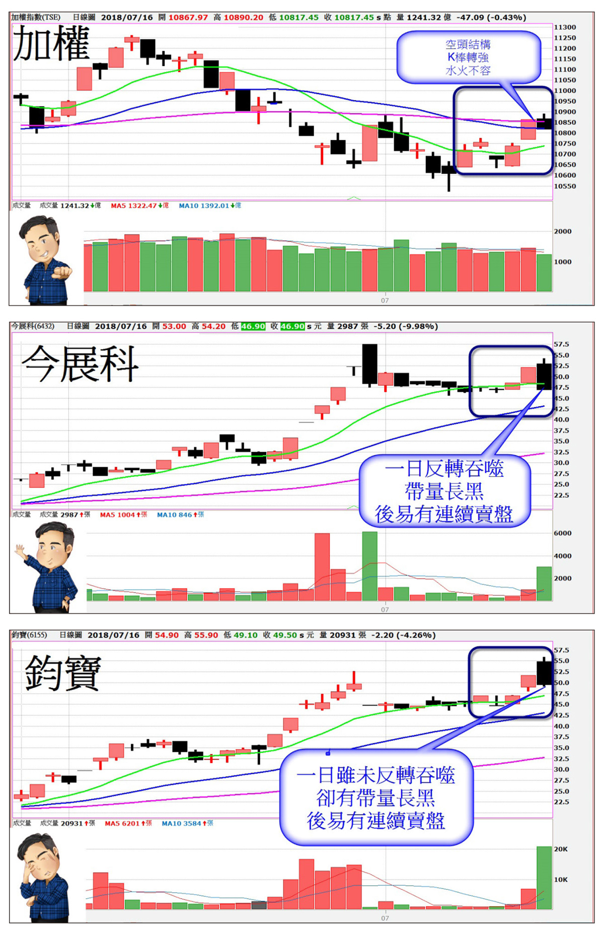 上周台股崩跌的行情由大立光帶領光學族群股先開上漲的第一槍,使得被動元件、矽晶圓、MOSFET等類股均從崩跌下跌結構線型,轉為止跌盤漲的溫漲走勢。最主要的止跌關鍵是加權指數強渡關山強行扭轉空方結構能量,用K棒長紅站上多空關鍵價,讓極短線的賣壓受阻而達到回補賣盤的期貨指數,以及讓權值股加溫往上走,但這也造成近期台股的熱門股,會漲但漲不遠,漲到一半就爆殺的情況,你知道主要的原因是什麼嗎?就是加權指數的結構,從上周線型已經告知各位同學大盤已轉為空頭趨勢,但還是有同學會說,你說的是空頭趨勢怎麼還往上拉呢?行情走勢以股價結構來看漲跌,就是用中長期的一段交易時間來判斷行情能否持續往上或是往下的關鍵,當一個中長期的行情轉為往下,只要K棒的組合性攻擊是往下攻擊,這次的行情就會容易有一個大崩跌產生。而上周的走勢先是走一個封閉下跌力道的反轉向上衝刺力道,形成長空短多的水火加溫衝擊,如易經卦所說的火水未濟卦,有強烈的火與大量的水互相衝擊,形成強漲後的強跌走勢,這也是一種消耗單一方向的推動行情能量,所以相對地買進持股的位置就比任何時間還重要,只要你是想要貪圖後面的漲勢而去追高,現在行情走勢絕對是見獵心喜被獵殺的主要對象,投資人一定要有這樣的概念。附圖所以當大盤結構與短線看法不一致時,就會走上面說的急漲後的急跌走法,以近期來看到的這種走勢,當推七月十六日的被動元件莫屬,尤其是本來我很看好的鈞寶(6155)及今展科(6432),以技術線型來看都屬彭哥最愛的多頭趨勢走勢,當結構好的時候卻出現短期成交量數倍的賣盤,這代表主力有非常積極想要賣出持股的狀態,容易後面出現連鎖的利空消息發布。而今展科的走法,從成交量、K棒吞噬的表現,可以斷定有大量的主力獲利賣出及散戶近期進場的停損量,尤其像七月十六日開高再追高買進的時候,遇到急殺的盤勢出現,你就會變成夜晚的貓頭鷹被燈照到呆住停滯,此時的行情又快又狠的殺盤,就是你在市場上追高殺低的標準作業流程,而這種失敗的作業流程是輸家擁有的,想成為贏家一定要避免追高殺低的動作。面對這種行情,千萬不要認為今天的行情強勢,隔一天的行情還能夠持續維持強勢,而且近期可以維持強勢的股票不多,用族群性來看也不是大家一起漲,這也加強對於選擇強勢股的成功性難度,投資人一定要秉持掌握最佳轉強位置出手,才能有效降低失敗率及加大停損區間的現象。