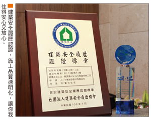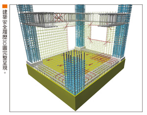 「建築安全履歷」針對施工品質透明化的呈現部分,對於地震來襲容易裂開、容易漏水及最難施工的每個細節點,均拍照錄影存證,且制定結構安全重點並舉辦教育訓練,協助輔導工地進行各戶結構重點呈現之位置檢討,其包括柱、牆、梁、版等相關之平面圖位置標記,讓查驗技師或工程師在後續鋼筋工程進行中,依平面圖標記之結構重點位置查核、改善修正並完成履歷拍照紀錄,使整個施工品質完全透明化。並舉辦「一樓鋼筋綁紮觀摩會」及「標準層施工品質觀摩會」,藉由觀摩會的舉辦,與業界分享建築安全品質的提升與建築安全履歷的重要性,且最後工地將履歷資料提送「建築安全履歷協會」做結構竣工審查與核定。建築安全履歷認證資料中包括結構施工顧問逐層查驗的施工查驗細節與品質重點照片,並將營建團隊逐層記錄的建築安全履歷照片及品質計劃、材料驗證記錄作為附件,以備公開查證認證成果,所以每一戶會有一本自己家的「建築安全履歷」,使消費者買得安心、住得放心。建築安全履歷認證始於民眾客製化需求的檢討,在經過現今各類系統智慧化的使用整合研究,包括:Alfa Safe耐震系統化工法、BIM的應用、無線通訊網路平台應用等等,提供給營建業供應端優化執行使用及公司全面品質的提升,總體整合過程完全符合智慧建築4.0的精神。而BIM(Building Information Modeling)應用在鋼筋工程中,其特點是藉由建築圖說及施工物件等相關尺寸資料,以電腦軟體程式操作形成3D圖形後,讓在辦公室做規劃的建築、結構等設計分析人員、鋼筋加工廠製造人員、工地現場施工綁紮工人及機電工程人員,彼此不再雞同鴨講,能立即有效溝通、共同討論得以解決問題。