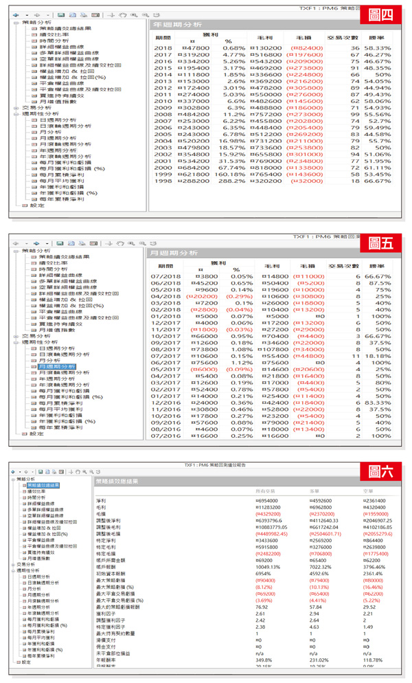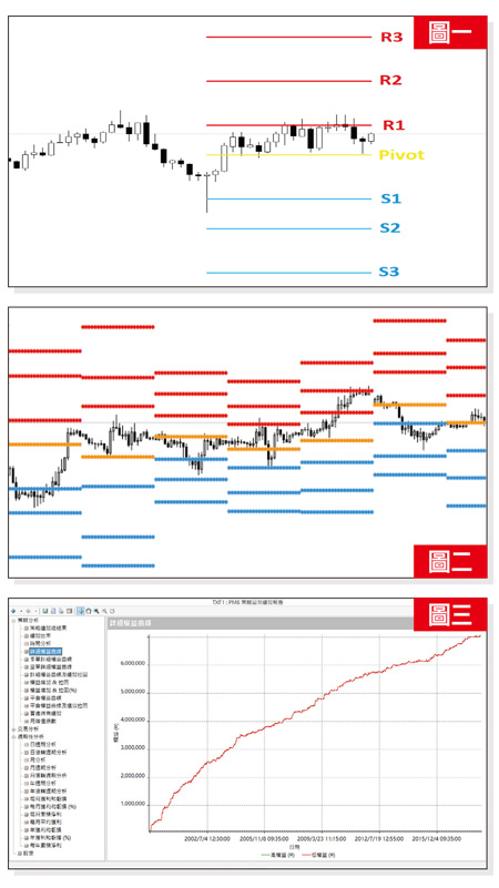 Pivot簡單明瞭,計算方法也很簡單,是個好用的指標,也可以再稍加變形,就會有很多不同的應用想法出來了。例如也可以放大規模,以上週(月)的高低價與收盤價,來計算本週(月)的Pivot、Support、Resistance。計算方法如下:R3(阻力點3)=H(高)+ 2x(P-L(低))R2(阻力點2)=P+(H(高)-L(低))=P+(R1(阻力點1)-S1(支撐點1))R1(阻力點1)=(Px2)-L(低)P(Pivot Point)=(H(高)+L(低)+C(收盤價))/3S1(支撐點1)=(Px2)-H(高)S2(支撐點2)=P-(H(高)-L(低))=P-(R1(R1(阻力點1)-S1(支撐點1))S3(支撐點3)=L(低)-2x(H(高)-P)計算出每日Pivot的這七個值,就形成如圖二的參考線範圍。二、大數據驗證Pivot程式的績效畫出這七條線後,程式就是去用二十年台指期的大數據計算,當盤勢碰觸到第幾條線的甚麼位置時,該做多或做空,可以得到最大利益。以下是以一口大台計算,本程式的獲利績效,圖三是策略程式的詳細權益曲線,在二十年的時間裡,獲利持續平穩的向上,波動不大。圖四是年週期的報表,過去二十年當中的每一年,都是正報酬,而且獲利都有六位數,也就是不論遇到多頭、空頭、盤整的盤勢,這支程式都是保持相當的獲利能力。圖五是月報表,最近兩年僅有四個月是賠錢。圖六是總績效表,二百四十個月的總獲利有將近七百萬元,平均一個月有二萬多元。如此一個穩定的程式,是不是會更放心來使用呢?如果您有興趣,歡迎來共同驗證。