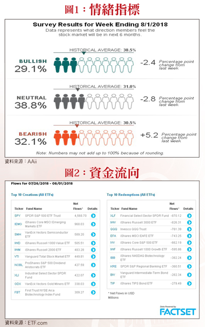 由於美股財報周進入尾聲,市場擔心後面恐無新利多來激勵股價,因此即便美股維持向上走高格局,市場情緒卻持續保守,但在蘋果股價創高破兆元重啟新一波漲勢帶動下,預期原先觀望的人會開始翻多,成為推升美股再戰高點的資金動能!觀察近一周(七月二六日至八月一日)美國散戶情緒指數(圖一),看多者再減二.四個百分點,降至二九.一%,已低於歷史平均值三八.五%逾九個百分點,乖離率已大;看空者增加五.二個百分點,升至三二.一%,略高於歷史平均值三○.五%。中立者在連續數週增加後開始反向減少二.八個百分點,降至三八.八%,仍高於歷史平均值的三一%,顯示選擇觀望者仍有不少。市場情緒及操作偏保守 美股仍有高點可期!同期間的ETF資金流向(圖二),與前一週情況一樣,資金持續追逐追蹤道瓊指數的SPY,單週買超四五.七億美元,但之後卻開始逢高站在賣方,光八月二日及八月三日兩日就賣超六五.六億美元。無獨有偶,前一週賣超第一名、追蹤那斯達克指數的QQQ,本週仍高居賣超第三名,維持逢高獲利了結的操作。偏偏此時那斯達克指數又再度轉強,若未來演變成軋空手,ETF市場將會有被迫回補QQQ的追價買盤(八月三日已躍居買超排行第一名,單日淨流入十二.七億美元)。另由於標普五百指數已領先創波段新高,不排除發現賣錯的ETF投資人,未來也會被迫回補SPY。注意買超第二名的IEMG,可發現ETF資金終於開始回補新興市場了,單周買超九.七億美元(八月二日及八月三日兩日續買IEMG六.一億美元),預期為新興亞股、新興市場ETF主要成分股的台積電(2330)及鴻海(2317),將會是被動式買盤資金回補的主要受惠者(例如IEMG投資台灣總權重為一二.五八%,投資台積電比重達二.九三%)。