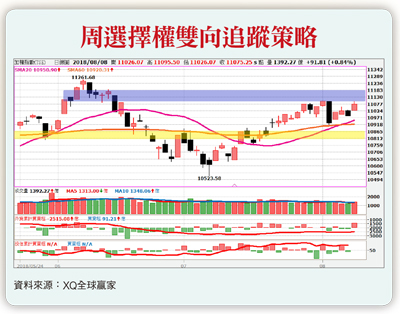 美國貿易代表署(USTR)本周正式宣布,將對中國進口的一百六十億美元商品徵收二五%關稅。即便如此,美股依然在科技股與金融股強勢表現下繼續攀高,與A股一路破底走勢呈現強烈對比。中國官方雖然透露將以Apple作為貿易戰的談判籌碼,但對市場的影響也僅有短短一天,恐怕在陸方有實際的條款出來之前,科技股還是會繼續反映財報利多。台股在權值股回神後,指數逐步收復八月二日的跌幅,並再次站穩一萬一千點準備挑戰前波高點。這次成分股重新振作起來,主要還是受美國科技股與蘋果財報的激勵,市場對於蘋果新機的拉貨潮期望升高帶動產業旺季。加上近期智慧型手機供應鏈、5G與生技等族群的財報公布,除了營收優於預期之外,對下半年營收也抱持樂觀看法,都是這一波台股能夠快速反彈的因素。觀察法人在現貨買賣超,可以看到外資在近一個月,慢慢地變成買超多過賣超。投信則是從七月的一○五二三低點,就不斷持續買超台股,表示法人已開始準備布局第三季產業旺季。從技術面分析,加權指數再一次來到一萬一千點,從均線扣抵值來看,月線目前位在低扣抵,月線仍將持續上揚,有利台股挑戰前高一一二六一點。配合籌碼的觀察,外資在台指期的未平倉,淨多單上升到五萬九千多口水平,外資多單維持在高水平。自營商在選擇權的未平倉部位,Buy Call在六千多口左右,Sell Put為四萬多口。整體觀察下來,技術面目前呈現偏多,籌碼也是偏多布局有利於台股挑戰前高,可以溫漲(買權多頭價差)策略來布局。