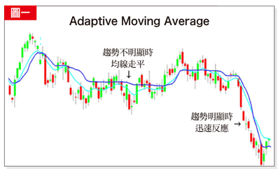 在七月這樣沒什麼趨勢,卻有比較多的上沖下洗盤,還能賺到二五○點誠屬不易,這是使用了Kaufman的適應性移動平均線Adaptive Moving Average(AMA)指標,所達到的成績,除了七月,當然長期來看歷史的數據也是不錯。AMA優於其他移動平均線的主要優勢在於它不僅考慮方向,還考慮市場波動率。我們是將AMA均線指標寫成程式來做自動交易,若您不會寫程式也沒有關係,直接拿現成的來用即可。均線是股票技術分析中最常用到的指標,因為它可以反映股價的趨勢。但是,短期均線太敏感,容易產生「假信號」,而長期均線又有反應太慢的問題。為了克服一般均線的弱點,就有了「適應性移動平均線」的概念。藉由AMA的公式,計算出AMA值以及一些相關的參考數值,由AMA值形成一條均線,使用方法與一般均線類似,它可以用來判斷趨勢方向和強度,還可以用來決定買賣時機,根據均線的轉折來產生交易信號時,為了減少「假信號」,還可以加入係數來過濾,例如,可以根據近期的波動率來設定係數。這也就是AMA指標具有自我調整性的特殊優點,如圖一。Kaufman的AMA計算公式:方向=價格-n日前價格波動率=sum(absvalue(價格-上一個交易日價格),n)效率=方向/波動率快速=2/(n1+1)慢速=2/(n2+1)平滑=效率×(快速-慢速)+慢速係數=平滑×平滑AMA值=上一個交易日的AMA值+係數×(價格-上一個交易日的AMA值)其中,價格是收盤價;n是週期數,10日;n1是短期週期,2日;n2是長期週期數,30日。