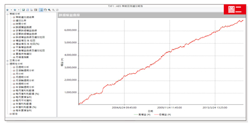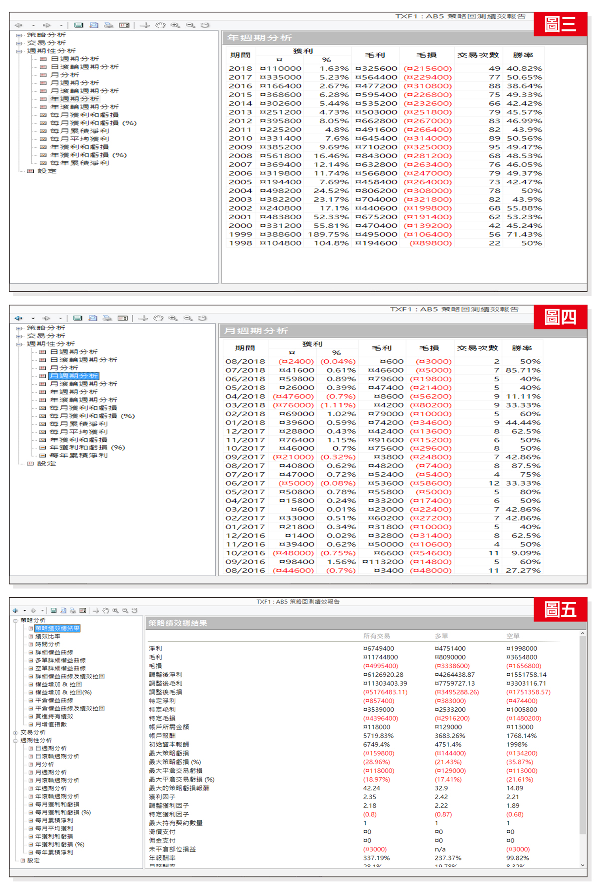 AMA值的計算方法看起來有些複雜,但它的使用方法很簡單,與一般均線類似,可以用來判斷趨勢方向和強度,還可以用來決定買賣時機,最簡單的用法就是均線突破。當盤勢往上穿越AMA均線時,表示上漲趨勢形成,做多。當盤勢往下穿越AMA均線時,表示下降趨勢形成,做空。AMA均線指標的優點是,相較於一般均線,反應更快,假信號更少,而且也保留了一般均線交易信號簡單明瞭的特性。AMA指標具有自我調整性,當趨勢盤時,AMA值緊隨著盤勢而變動,類似短週期均線;當盤整盤時,AMA均線走平,類似長週期均線。AMA均線的缺點,其實也如同一般均線的問題,有時候會出現均線糾纏,發生信號忽多忽空的錯亂。要改善這種情況,就需要加入濾網或者其他指標來組合判斷,或者等盤勢突破較遠距離才視為有效突破。以下是以一口大台計算,AMA程式的獲利績效,圖二是策略程式的詳細權益曲線,在二十年的時間裡,獲利呈現四十五度角持續向上。圖三是年週期的報表,過去二十年當中的每一年,都是正報酬,即使今年還未完成,就已經如同前十九年,獲利都有六位數,也就是不論遇到多頭、空頭、盤整的盤勢,這支程式都是保持相當的獲利能力。圖四是月報表,可以看出明顯的賺錢的月份比賠錢的月份多,而且六月與七月確實也是很不錯的表現。圖五是總績效表,二四○個月的總獲利有大約六七○萬,平均一個月有二萬多。