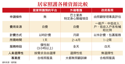 照顧年長父母是一件難以形容的事情,很多照顧者在裡頭苦不堪言,但你問他你是不是很希望這個事情明天就結束,他可能只能看著你,然後一句話都說不出來。」作家張曼娟幾句話,就道出了家庭照顧者的心聲。不只是張曼娟,許多名人,如楊貴媚、吳若權、侯昌明等,都經歷了照顧父母的辛酸史,更別說一般人,不是為了照顧親人而辭去工作,就是長期在體力、情緒上的耗盡下,創傷累累,因為照顧,屢見不鮮的社會悲劇更時有所聞。今年台灣正式邁入高齡化社會後,家庭照顧問題只會更加嚴峻。台灣在儒家以孝為先的觀念下,家中有人因病臥床,大都優先考慮由家人照顧,萬不得已才會找他人幫忙,或是送到養護機構。但照顧的重擔,並非只靠親情支持就夠了,除了身心的消耗,還有許多照護專業上的考量,包括飲食、生活協助、設施改善,或是情緒引導、復原(減緩惡化)的訓練等,都會影響病人的狀況,如果缺少外部協助,對家庭照顧雙方都會產生許多副作用。外籍看護、長照2.0有條件限制事實上,根據統計,去年在台外籍看護已經超過二十四萬人,是目前除了家庭自行照顧之外,最常見的居家照顧模式。外籍看護每月費用約二萬多元,而且全天候都可以在病人旁邊照料,是一般人較為經濟的選擇。但申請外籍看護必須具備一定條件,許多人卡在「巴士量表」過不了關,並非人人可行,何況還得經過數個月漫長的等待。另外,即便能請外籍看護,語言、飲食等也需要一段時間適應,加上他們多數都沒受過專業的照顧訓練,除基本的生活照料之外,能提供的照護非常有限。除了外籍看護之外,政府從長照十年計畫,到現在的長照2.0,提供越來越多的照顧協助,服務對象也越來越廣。以居家照護來說,從沐浴、翻身、備餐到陪同就醫等都有,即使非低收入戶也能申請(補助比例不同)。政策雖然越來越重視,但政府資源畢竟有限,以前採時數制,現在是由照顧管理專員評估可使用的項目,對有需要的家庭而言,仍很難滿足,加上目前只在白天提供服務,有些家庭無法採用,在人力限制下,更別談選擇合適的照顧人員。