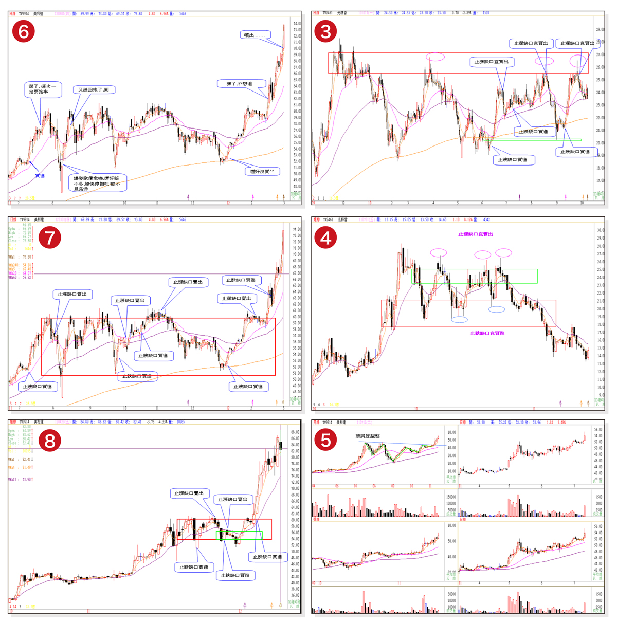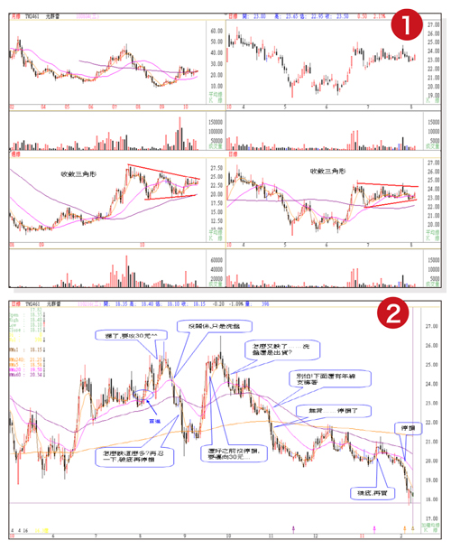 希望僥倖貪婪恐懼當手中有單時,通常會抱持希望、僥倖心態。股市名言:市場最大。不論你多麼看好手中股票,當出現賣出訊號時,就不應該猶豫。我在市場繳了不少學費,付出慘痛經驗。有句名言:一切事情的發生,都是最好的安排。成功或失敗的經驗造就今天的我,股票停損就當成是做布施。學習箱波均後,老師教導,操作要先規劃,但不可執著規劃,當下即是。依照訊號買賣,不受當時的消息或是自我主觀影響,這是比學習技術分析更難的學習功課。李安導演說:既然是自己相信的東西,就要堅持。我現在相信箱波均,堅持學習箱波均並不斷精進。回顧以往操作失敗案例,再用箱波均操作,比較兩者差異,希望提供給讀者作為借鏡。案例一:二○一○年中買進光群雷。買進原因:中概題材股。週線型態為收斂三角形,日線也是一樣的型態,且均線多頭排列,判斷為中繼整理,目標價三十元。當時的月週日線如圖一。買進後,心情隨著股價起伏!回檔時,因為看到有均線支撐、箱頂和箱底支撐就安心抱股,懷抱希望,捨不得賣或等一下再賣,錯失很多次出場機會,抱了兩個月,最終以停損出場,之後還因為疑似底部又再次進場,結局仍舊一樣(圖二)。若以箱波均的缺口操作法,即可以避免在高檔有賺錢沒賣而最後停損的冏境(圖三)。缺口操作法用在週線操作也可以賺到差價(圖四)。案例二:二○一一年看到美利達月線突破頭肩底,且上面沒有壓力,見獵心喜,不管三七二十一就買進。當時的月週日線如圖五。買進後,沒多久就爆發歐債危機,我只好出場觀望,賣出後就不想再買回(圖六)。一方面國際消息風聲鶴唳,好像世界末日;一方面我不知道美利達是修正還是做頭,這個不想買的念頭讓我之後望股興嘆。其實這種想法就是恐懼。股市名言:危機入市。行情總在絕望中誕生。記住了! 圖七是箱波均缺口操作法。若以缺口操作法操作週線,也有不錯的利潤(圖八)。