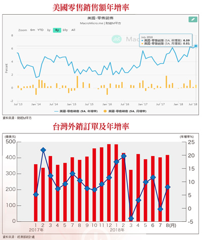 近期台灣加權指數仍處於狹幅橫向整理,且尚未站上長短期均線糾結區;櫃買指數則更顯弱勢,均線有開始向下發散的現象。顯然現階段的交易結構呈現國內投資人比外資機構更為悲觀,而核心的原因明顯來自於市場人氣族群股價的連續修正有關。美股強勢有所本 有利台股修復期往壞處想,市場籌碼的沉澱還需要時間,除非外資回頭推升權值股,否則多頭大步推進的機率相對小。但往好處想,歷史經驗告訴我們,市場氛圍保守悲觀之時,不符合崩跌條件(波段急跌),尤其是美股仍舊維持強勢。美股道瓊指數剛創波段新高,S&P500指數碎步盤堅,隨時可望再創段新高,在這樣的背景下,要台股連續性獨跌不是大概率事件,唯一美中不足的是費城半導體指數為美股四大指數走勢中最弱者,難免影響市場信心。從風險防範的角度,任何階段保持警覺無可厚非,不過目前為止,美國經濟基本面確實仍未出現重大瑕疵。日前美國公布七月零售銷售數據,經季調後月增○.五%,連續六個月成長,優於華爾街日報訪調經濟學家預期的月增○.一%;年增率則達六.三九%,為六年來的新高,十三個主要零售類別中有九個呈現成長。日前美國零售協會(NRF)表示,今年因減稅、就業強勁,薪資溫和成長等因素,預估將持續推升美國消費支出明顯成長。NRF預估二○一八年返校季消費支出約為八二八億美元,其中大學返校支出的預期將較中小學為佳,預估今年不含汽車、汽油及餐廳銷售的核心零售銷售,至少成長四.五%,高於先前三.八~四.四%的預估區間,今年度將是二○一一年以來最高的成長率,而美國經濟增長超過七成來自消費支出,由七月零售表現優於預期來看,現階段可望持續擔任支持美國經濟成長的主要動力。目前多項主要領先數據中,僅消費者信心指數出現小瑕疵,新公布的八月美國密西根大學消費者信心指數,由七月的九七.九降為八月的九五.三,我們將持續追蹤其是否出現連續性走低。台股籌碼加速沉澱 迎接出口旺季現階段雖有貿易衝突擴大的外部干擾,但我們仍然要再次強調,人為造成的利空,也十分有可能短時間就翻盤扭轉,只要能上談判桌,都是好的開始。先前美國宣布的二千億美元關稅清單之聽證會正進行之中,美國最大遊說團體美國商會(US Chamber of Commerce)在聽證會中,持續提醒白宮,此清單商品範圍極廣,影響層面將急遽擴大至企業、民眾、工人等,增加美國人生活支出,進而影響美國經濟,所以也將極力爭取豁免項目。目前風險趨避的保守氛圍,也促成股市籌碼的加速沉澱,由整體融資餘額的持續減少可得到驗證,而時序上即將進入台灣的出口旺季,這剛好是有利於台股多方的背景條件。至於台灣出口是否進入旺季,需觀察外銷接單數據,根據經濟部新公布的七月外銷訂單,為四一八億美元,創下歷年同月新高,月增率三.七%,年增率七.九五%,淡季谷底已過。七月資訊與通信類訂單年增五.三九%,電子零組件訂單年增九.九四%,機械類訂單年增一二.六%;筆電訂單回升、智慧型手機新機接連上市,可望帶動晶圓代工、記憶體、被動元件、晶片、印刷電路板、封測等供應鏈接單暢旺。以地區別來看,接自美國的訂單金額一一七.四億美元,創歷年同月新高(主要以資訊通信產品增加四.五億美元最多);接自中國大陸及香港訂單金額一○九.五億美元,其中電子產品增加六.六億美元,年增一八.四%最。