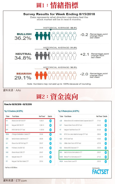 即使土耳其風暴席捲新興市場,似乎也無法動搖美國市場氣氛,投資人信心出乎意料的強勁,美股多頭行情是否已見高,目前恐怕還不能太早下結論。觀察近一周(八月九日至八月十五日)美國散戶情緒指數(圖一),可發現才剛翻多的投資人信心相當堅定,看多者比例僅小減○.二個百分點,降至三六.二%,低於歷史平均值三八.五%。反倒是看空者比例則意外減少二個百分點,降至二九.一%,低於歷史均值三○.五%,顯示看空者信心持續動搖。觀望中立者則回升至三四.八%,略高於歷史均值的三一%。投資人信心意外強勁 有利美股多頭延續同期間的ETF資金流向(圖二),同樣可以見到投資人風險偏好逆勢提升的情況,前一週剛被獲利了結的SPY(追蹤標普五百指數),如預期重回買超排行第三名外,前兩名也都是追蹤標普五百指數的IVV及VOO,三檔ETF資金淨流入高達四○億美元。受負面干擾因素影響的新興市場ETF,也未出現在賣超排行中,也可看出ETF投資人的信心強度。唯獨近期產業出現庫存雜音的半導體ETF (SMH及SOXX),已開始出現賣超排行中,相關成分股的股價恐將受到壓抑。但晶圓代工龍頭台積電(2330)除了是費半指數成分股外,同時也是新興市場、新興亞洲及AI相關等ETF的重要成分股,隨美元指數轉弱,資金回補新興市場或者從半導體轉向新興科技ETF,都會為台積電帶來被動式買盤,支撐股價維持在高檔,與費半指數走勢的高度相關慣性可能也會改變。相較於競爭力強又有被動式買盤護身的台積電,其他台灣半導體廠恐就不會那麼幸運,面對中國拉高自製化、中國消費市場力道減弱的轉變,中國營收占比高且進入門檻不高的廠商,長期營運將迎來不小的調整空間,過去台積電帶動同族群股價同漲的效應也可能大幅降低。