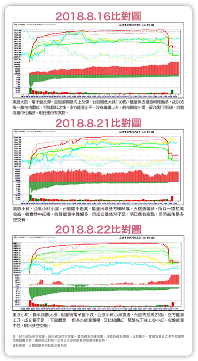 上周本欄已說明:台股趨勢轉空,一○八五○加減二十點為短線壓力,而八月十三日的日線跳空缺口則為大壓,反彈遇壓找賣點,但下殺破低則又會反彈。上周二(八月十四日)及上周三(八月十五日)都是接近短線壓力區就作壓回,上周四(八月十六日)美股大跌,電子盤反彈,亞股都開低向上反彈,台股開低大跌一一○點,破低來到一○六○六點,但能量與五檔張明確偏多,故九點零五分後一路拉抬翻紅,可惜翻紅之後,多方能量走平,沒有繼續上升,故拉回收小黑,留七十八點下影線。收盤能量中性偏多,表示還會繼續反彈。上周五(八月十七日)與本周一(八月二十日)連續兩天小漲,成交量也連縮兩天。八月二十一日美股小紅,亞股小紅小黑,台股開平走高,能量出現多方喇叭嘴,五檔張偏多,所以一路拉高收高,收實體中紅棒,漲九十三點。收盤能量中性偏多,但成交量依然不足,表示次日應有高點,但開高後易多空交戰。八月二十二日美股小紅,費半指數大漲,但盤後電子盤下跌,亞股小紅小黑震盪,台股先拉高二十五點,空方能量上升,成交量不足,下殺翻黑,但多方能量積極,又拉抬翻紅,尾盤先下後上收小紅。收盤能量中性,隔天多空交戰。台股從八月一日一一一○○高點下跌到八月十六日一○六○六低點,約五百點。期間並無嚴重賣訊,表示中線仍在今年初以來的大區間整理當中,並非長線跌勢。但短線從八月十六日至今連續反彈四天,也重新站回年線,成交量卻如溜滑梯一般連續萎縮。八月十六日成交量尚有一三九一億,在月均量之上,之後四天卻是一二六九億、一一三五億、一一二五億、九七五 億,以這種成交量要突破短線壓力區一○八五○加減二十點都很困難,更不要說去回補八月十三日的大跳空缺口一○九三九至一○九八三點。因此未來兩天衝高遇此壓力區都容易壓回,直到出現明顯遞增量,才有辦法突破。然而,各位也不必太過悲觀。台股本波下跌,不僅完全沒有賣訊,多方能量也一直相當積極。表示多方控盤者並不看壞後市,而是藉國際利空,進一步清洗籌碼。這從融資餘額過去十二天大減了一一四億,就可以看出。加權指數並未跌破一○五二三與一○四七八點,而融資餘額卻比一○四七八點當時還低,比一○五二三點更大減一○九億。因此,這次回檔結束後,不論破不破一○五二三點與一○四七八點,估計台股很可能會展開波段上漲,也就是有機會去突破一一二七○點的波段高點,各位可以好好把握。