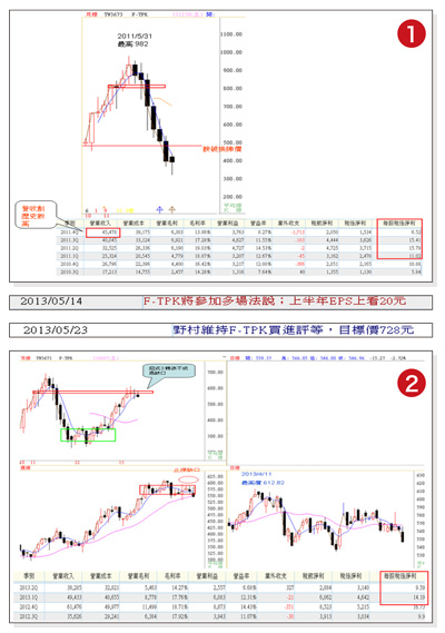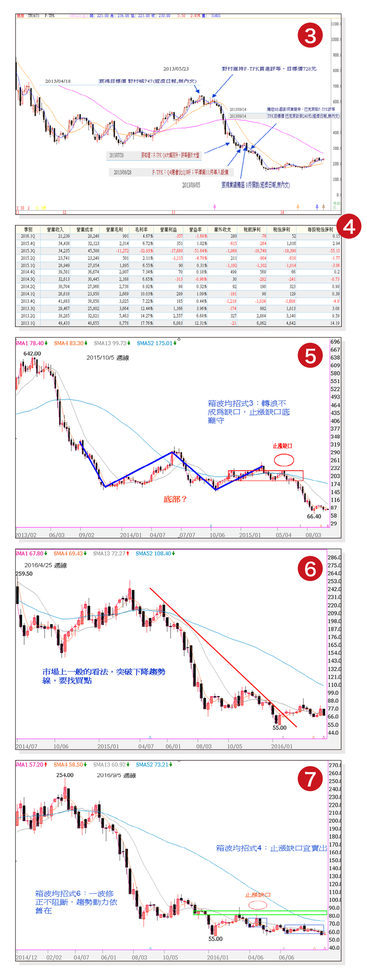 昔日股市三千金 如今百元有找在我身邊有朋友因為聽聞投資人在股市中賠掉身家財產自殺,而對金融商品投資厭惡,個人覺得不必因噎廢食,水能載舟亦能覆舟,刀子可以切菜也可以成為兇器,但這樣的事件真的是層出不窮,我平常只要看到圖,就可以想像在高點有人被套牢,不僅賠錢,更慘的也許影響家庭生計;在低點有人買進賺錢,不斷上演財富重分配的歷史。學習技術分析就是要避免落入主力圈套,並成為個人理財工具。宸鴻(股票代碼:3673)於二○一○年風光掛牌,為觸控技術龍頭,電視報紙等媒體爭相報導這家公司,初上市時,藉著基本面和蘋果加持,股價一路向前衝至近千元,雖說二○一一年因歐債危機,全球股市大跌,但宸鴻公布的獲利與營收數字頗佳,二○一一年第四季還創歷史新高,但股價卻跌破掛牌價(圖一),是撿便宜的時候嗎?股市中財務數字和消息面,虛虛實實,通常股市中好消息發布時,就是股價高點,宸鴻獲利並未變差,但股價卻創新低,同時期有主力照顧的股票,都可以守住關鍵位置,之後再創新高,所以投資人應該以技術面為進場依據。二○一三年中,以箱波均判斷宸鴻將要進行修正,週線已止漲,股票持有人應該要先出場,而當時新聞如附圖,都是好消息,法人也看好,股價卻早於二○一三年四月十一日創高後,不再回來(圖二、圖三)。對照之後發布的財務數字(圖四),股價已經先反映公司未來營運要走下坡,早有知情人士先走一步,投資人如何能看基本面買股票呢?在二○一四至二○一五年長達一年多的盤整,在我沒學箱波均前會認為這是個很漂亮的W底,除非跌破低部才是築底失敗,但以箱波均看圖就可以提早知道這是個失敗的底部,提早洞燭先機(圖五)。股市操作要比別人早一步,當大家都還看不出來時,你先動作才有大利潤!曾為股王的宸鴻跌破百元後,不少人對它投以關愛眼神,在二○一六年三、四月間,臉書社團有不少人看好它,認為它盤整數月,已經突破下降切線,是買進時機(圖六),甚至喊出今年買宸鴻,明年開香檳!?因為我學了箱波均,便會判斷宸鴻仍在跌勢,不斷的向下轉浪,尚未出現買點,也就避免被市場上所謂的高手迷惑,不然到現在還住套房呢(圖七)。箱波均就像股市照妖鏡,是一個可使投資人趨吉避凶的法寶。