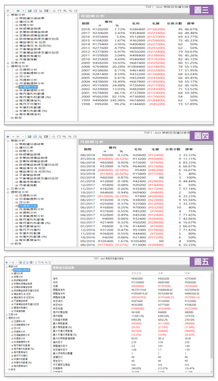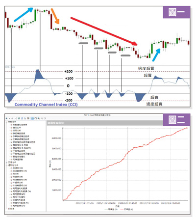 CCI指標Commodity Channel Index也稱作般若指標、順勢指標等等,發明者是Donald Lambert於一九八○年代提出。CCI指標在台灣程式交易界普遍被使用,不只用在台指期,連開發海外期貨程式,也有很多台灣的程式交易開發者用到CCI指標。可能資料容易取得,績效也不錯的原因吧,所以被廣泛使用。從英文原名Commodity Channel可知它有通道的概念,也就是有通道的上緣以及下緣。超過或逼近上下界線,就採取某些動作的概念。但是從先前布林通道與凱特勒通道的介紹可以知道,在美國投資市場開發出來的通道類指標,很容易形成當盤勢到達通道上下緣,表示超買或超賣,原始開發者建議執行的動作是反向,超買就做空,超賣就做多。總之,美國投資商品似乎容易在通道間前進,但台灣的投資商品常常不是這麼一回事,也就是要將使用方式做改變,才能適用在台灣的投資商品。以下就來看CCI指標的原理,以及我們用CCI策略開發的程式績效。若您不會寫程式也沒有關係,直接拿現成的來用即可。CCI指標的公式計算如下:CCI(N根K棒)=(TP-MA)÷MD÷0.015 TP=(最高價+最低價+收盤價)÷3 MA=最近N根K棒收盤價的累計之和÷N MD=最近N根K棒(MA-收盤價)的累計之和÷N 0.015為參考係數,N為計算周期K棒數 由以上的計算公式,可以得到每根K棒的CCI值,這個CCI值可以介於負無限大到正無限大之間,如圖一,根據原始定義,CCI值在正負100之間時,是正常盤勢波動,繼續保持觀察即可,當CCI值在100以上表示盤勢已經超買了,超過200是過度超買,可以逢高做空。CCI值在-100以下,已經形成超賣了,低於-200是過度超賣,也就是要逢低做多。但是使用在台指期,不見得要依照這個定義,我們拿台指期二十年的歷史數據,回測出最佳的買賣點參數,以得到最大利益。以下是以一口大台指計算,從一九九八年到現在的獲利績效,圖二是策略程式的詳細權益曲線,在二十年時間,獲利大致呈四十五度角持續向上。圖三是年週期報表,過去二十年中的每一年,即使今年還未結束,也都是正報酬,而且都超過六位數。所以不論遇到多頭、空頭、盤整的盤勢,這支程式都是保持相當的獲利能力。圖四是月報表,可看出賺錢的月份明顯比賠錢的月份多。圖五是總績效表,二四一個月總獲利大約六九○萬,平均一個月有二萬多獲利,可見CCI指標是個穩定獲利的策略,如果您有興趣,歡迎共同來驗證。