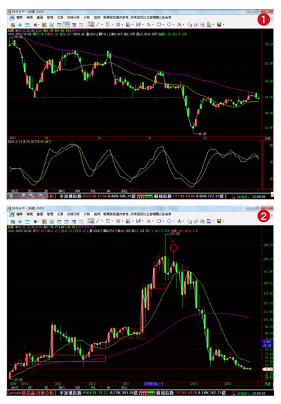 箱波均操盤法:圖二為月線格局,在二○一○年三月三十一日取其收盤價五七.八元作為箱頂(圖二之1處),在二○一○年六月三十日取其收盤價四十八元作為箱底(圖二之2處),股價形成過頂不破底的買進訊號。股價上漲過程中,回檔箱都不重疊,乖離過大要抱牢。最後在3的位置形成止漲缺口作賣出動作,漲幅約三倍。由此可知箱波均可以找出主力控盤的軌跡,如同照妖鏡般,任何動作都無所遁形,事後發現股價拉抬是因董監改選。