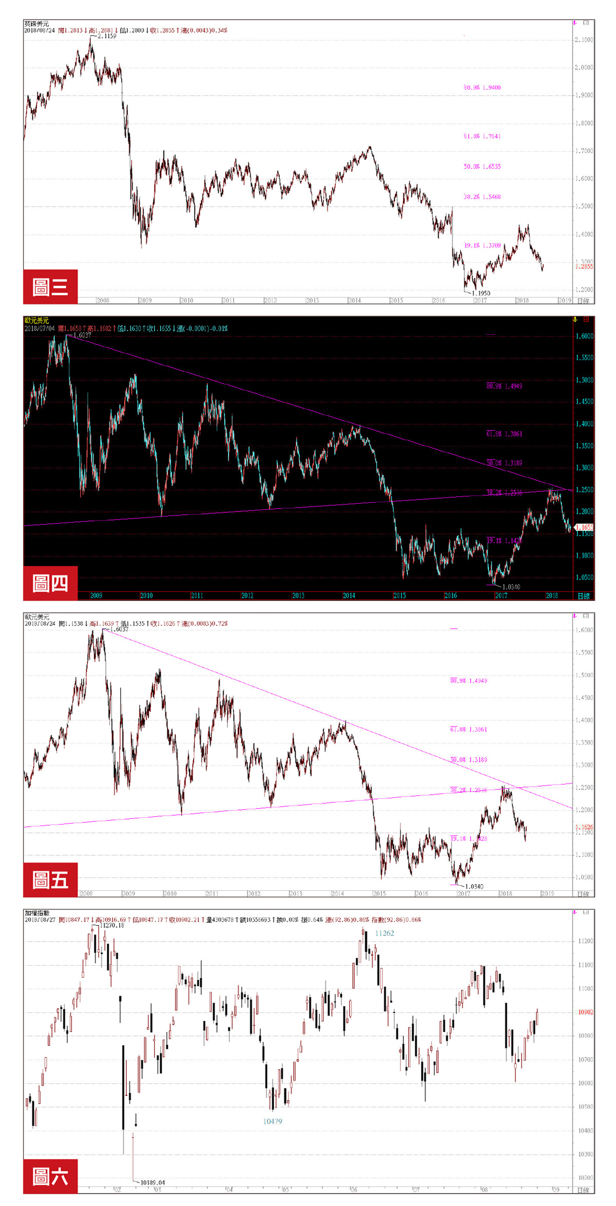 今(二○一八)年美元指數從二月十六日的八八.二五一路上漲到八月十五日的九六.九八,共升值九.八%,全球其他貨幣相對弱勢,連帶中國、日本二大經濟體都倍感壓力,尤其中國發行高達五千億的美債可能將增加九.八%,近五百億的成本,的確不是小數目。所幸美元短期技術性回貶,雖然中長期仍有回升九八.一三至九八.六三的機會,但就技術面而言,美元指數若跌破九十四,長期將再回探八八.二五尋求支撐(圖一)。所以就今年美元升值所帶來的壓力,未來將有所減緩,但需留意的是美股的震盪修正。相對於美元的回貶,澳幣及加幣一樣都有貶值的壓力,不過看日圓應有不少升值空間。記得在九三三期專欄(7/13-7/23)文中提到瑞郎、英鎊及歐元,以弱勢的瑞郎來看應無明顯趨勢變化,英鎊則從當時一.三二三一(圖二)持續跌到一.二六六二(圖三)(亦印證當時推估會跌到一.二七五九以下),當然短期會有反彈一.三二三三至一.三五一九機會,但英鎊因為還處於空頭市場,所以未來需留意一.一九五○不可跌破,否則會有下探一.○九八六的機會。再來看看適合作多的歐元,當時在一.一六五五(圖四)雖然有下跌到一.一三○一,但目前仍在一.一六二六(圖五),而對於之前推估的上漲位置一.二五到一.三一則看法不變。那AI程式運用在外匯的研判操作效果如何呢?這就留待以後再說明了。再回到台指期貨AI程式的重點,電腦程式在研判操作上當然還是會有不完美的地方,也就是無法每月都賺錢(前期都有附圖說明),今年到目前為止,對於全自動程式交易者來說普遍績效不會太好,因為大盤除了一、二月有千點行情之外,三月到八月也不過在一○四七九至一一二六二(圖六)區間來回走,高低點只有七八三點,操作難度很大,但在這樣的行情下,我們的程式沒有間斷,也沒有調整策略,一至八月一口期貨單的績效仍有近八百點約十六萬元的獲利,應該也打敗多數投資人的績效!所以不管盤勢如何,能穩健獲利最重要,它不會讓你短期賺大錢,也不會讓你血本無歸,短期賺大錢的人容易犯下貪婪與恐懼的錯誤,可能導致投資失敗,最後退出市場。從二○○八年金融危機到二○一五年陸股崩盤,再到歐債危機、英國脫歐等大小行情交易,也證明我們AI程式交易的穩健獲利。想要您的投資安心,想讓您的資產倍增,趕快來體驗我們的AI程式吧!