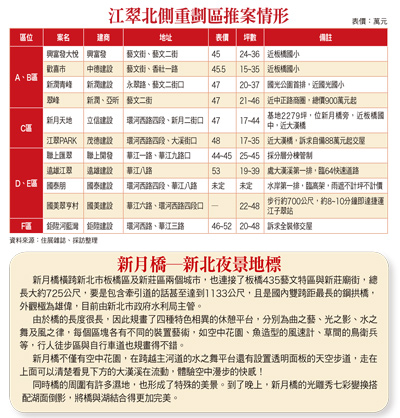 永慶房屋中正直營店店長蘇貫瑜表示,新的重劃區,生活機能尚未到位,因此,主要都要仰賴周邊已成熟的商圈,以江翠北側A、B區來說,鄰近板橋區中正路,未來出入都要走到中正路搭公車,藉由310及307等公車路線,轉至板南線的府中站搭捷運,或至板橋車站換搭捷運、台鐵及高鐵。雖然沒有直接靠捷運站,但因中正路商圈成熟,加上附近又有「435藝文特區」,此區常辦藝文活動,外界都以「小華山」文創特區稱之,因此吸引一些喜愛藝文活動的購屋客群。A、B區房價千萬元蘇貫瑜說,新潤建設一年半前銷售的「青峰」,每坪開價約四十七萬元,成交價約在四十二至四十三萬元,此相對中正路沿線的指名社區「環遊世界」的三十八~四十萬元、「中正月灣」的四十~四十一萬元,「世界之藝」的四十七~四十八萬元,以及「中正富逸」的五十萬元房價來說,新房子的房價並沒有比中古屋高多少。蘇貫瑜說,造成「新不如舊」的情況,主要是房市處於低檔,建商再也不能像往年那樣的競開高價,再者,舊社區因居住穩定,成交量不大,價格雖在這波房市拉回整理,普遍下滑一成,但也有跌不下去的情況。但新的重劃區,相似的建案不少,可選擇的建案比比皆是,因此,形成房價上漲的抗性,除非是大建商的品牌力能讓建案比別的建案每坪多個兩三萬元外,大多數建案仍得要「搶客人」。根據了解,像興富發「大悅」一推出時,就主打八月底前購屋可抽東森嚴選名品家電,另主打新板藝文特區旁,二至三房,「訂簽開二十九萬元」起,樂當城堡主人,近期在華江橋旁的戶外看板則是「月付九千」。而中德建設當初推出「歡喜市」時,則主打「不用九百萬元,可買社區兩房」,且打出區域最低價廣告戶六八八萬元起。新世代買房喜新厭舊蘇貫瑜表示,由於房市景氣還沒全面復甦,加上近兩年流行「低房價、低總價」的二房新趨勢,因此,江翠北側重劃區的建案,除非基地夠大、位置夠漂亮(水岸第一排),才會有五十坪以上較大坪數的建案外,大都流行小二至三房的建案。而此區的房價約在一千萬元以內,對於年輕的首購族來說,比較買得起,可一圓買房子的夢想,加上新世代「喜新厭舊」,又多挑有電梯的物件,因此,即便要走十分鐘的路程至中正路來搭公車,還是有吸引力。由於年輕族群競往新重劃區購屋,相對來說,中正路商圈的中古社區,以換購族群居多,此外,受到重劃區新建案競出,中正路沿線的舊公寓買氣就備受衝擊,成為較大的受害者。而江翠北側C區,西以板橋國中的東側為界,東以大漢橋西側為界,橫跨新海橋及大漢橋,面距較寬,區內有嫌惡設施新北市殯儀館,是購屋者要列入考慮的部分。但該區沒有高架橋遮蔽,面河岸第一排的建案,較不會被擋,且西側鄰近新北市夜景地標的「新月橋」,大漢橋附近,未來可就近搭乘捷運環狀線的新埔民生站。而區內先有「江翠ONE」,接著,甲山林機構再操盤「新外灘」系列建案,除了媲美大直水岸住宅外,更拿來跟上海的外灘相比,營造新的建築視野。此區若要通勤上班,未來可至捷運環狀線新埔民生站,再走遠些,可至捷運板南線的新埔站,根據了解,未來重劃區人口進駐後,屆時會規劃小型公車路線跟捷運聯通,對外交通不致不方便。