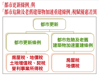 其次,另一讓都更戶難以了解的是,以上兩個都更糾紛案,前者是不同意戶進行抗爭,後者卻是同意戶發動抗議。至於最近由台北市政府主辦的蘭州街斯文里公辦都更案,明明是以「權狀坪換室內坪」已經是再優惠不過的條件,居然還有不同意戶進行抗爭,真令人匪夷所思。因此,若欲都更順利推動,就應加強履約保證機制的宣導。都更稅費知多少? 都更前後為何差異那麼大?依都市更新條例之規定,稅賦減免項目包括房屋、地價稅、土地增值稅、契稅與營利事業所得稅,惟都市危險及老舊建築物加速重建條例則只有房屋稅與地價稅,如能兩者稅負規定一致,必然有助於都更之加速推動。通常房屋稅會隨著折舊而逐年降低,惟都更後新建物必然會隨著評定現值的調整而大幅提高,其中尤以豪宅影響最大,而在都更整合之初建商也無法預估會增加多少稅費,也因無法給予明確答案,導致雙方互信基礎不足而爭議時起,尤其如有都更戶發生無力負擔情事,對於日後都更之推動也會有相當程度的負面影響。