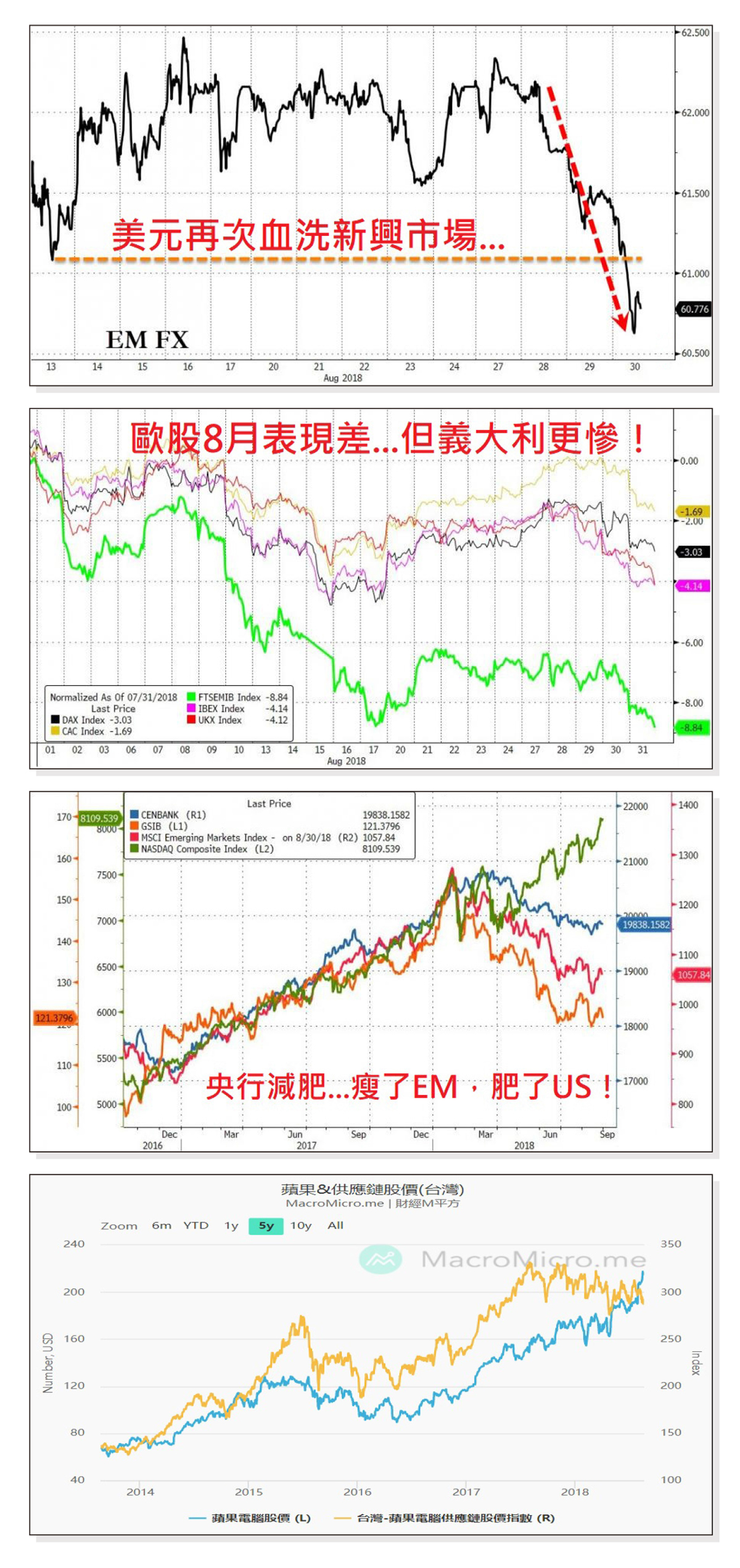 上周五(八月三十一日)歐美股市表現大不相同,美股在科技股的撐盤效應之下,指數維持在相對高檔強勢震盪,但歐元區卻出現了大幅度回跌的表現,主要原因在於新興市場被美元強勢血洗的效應擴延,帶動義大利再次出現債市危機,連帶出現歐元再次走貶,同時義大利股市更面臨到即將破低、底的危機,換言之,歐元區危機再次浮現,本波反彈走勢最強的英國股市在假突破確定之後,確定結束多頭反彈的這一回合。歐元區將被新興市場拖累與此同時,德國股價指數也面臨到回測前波低點的危機,從這裡可以明顯觀察到歐元區恐怕在土耳其危機無法止血的狀況下有被拖下水的疑慮,這波強勢美元血洗新興市場到目前為止還沒有看到明顯和緩的現象,也就是說歐元區可能是下一波被新興市場拖累的區域,這也引發了全球金融體系再次走弱,即使長短天期利差在長天期利率拉升的過程中出現了微弱的反彈,然而面對新興市場資金撤走的趨勢,恐怕不是可以簡單化解得了的。英鎊、歐元營造美元弱勢假象這波美元指數看起來在日線上出現了假突破轉弱,雖然是建立在川普刻意干預的前提下,但這次美元指數假突破後卻沒有去年年底回檔趨勢來得明顯,最主要的原因在於美元指數的成分貨幣的表現,這次主要轉弱在於英鎊、歐元的止貶反彈,也由於這二大貨幣在美元指數中占權值近七○%,所以當英鎊、歐元升值時就會讓美元指數走弱,而讓美元有了走弱的假象。美元持續血洗新興市場但是匯率是兩國貨幣交叉的比率,在美元跟新興市場匯率的交換上,新興市場貨幣仍是貶得相當嚴重,包括土耳其、阿根廷、巴西、印尼、南非,甚至連GDP創高的印度盧比也出現了快速貶值的發展,若是直接觀察黃金就可以發現黃金即使出現跌深反彈,卻也無法走出大波段強勢反彈,代表美元仍然維持在超強勢的格局,甚至從月線的角度來做長期觀察,美元仍然在長線的強勢結構中,因此可以預期新興市場將持續被抽血,這些資金將流回美股幫川普護盤,美股得以在未來一段期間維持獨強格局。電子傳產交棒不順 蘋概股將成「貧」概股從台股的表現來看,摩台指結算後的轉折真沒預料錯,上周五留下的空方攻擊缺口並沒有出現有效回補(收盤站上),再加上電子股持續不斷地走弱,明顯地與筆者先前提到的電子股並沒有明確可以帶領指數上攻的產業族群,這些產業不外是半導體、蘋概或被動元件,而這些產業表現只能用「慘不忍睹」來形容,雖然電子該接棒傳產,可惜的是竟然掉棒!台股將可能再次面臨年線保衛戰,又或者是大頸線保衛戰!蘋概股的表現更是超乎預期的弱勢,與過去的成群結隊上漲不同,這次只有零星幾檔個股能夠維持漲勢,看看蘋果股價與供應鏈之間的股價指數關係脫鉤非常明顯,未來三至五年內台股供應鏈恐怕跟蘋果股價的相關係數將持續下降,建議在操作蘋概股時逢反彈站賣方,台灣電子股未來將無法再靠一顆蘋果能撐住的了!圖一