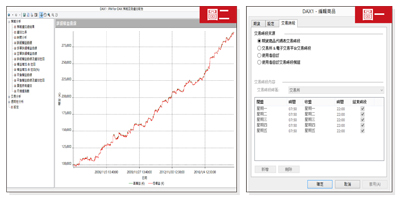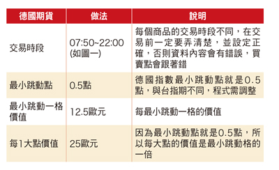 操作海外期貨第一考量是為了規避風險,第二考量是選擇好做的商品來增加獲利。以這樣的考量來說,德國指數期貨是一個不錯的選擇,因為德指走勢與台指期的關聯性比較低,畢竟德指反映的是德國企業以及歐洲經濟的狀況,與台灣這邊相距較遠,所以將資金分配在操作台指與德指兩部分,比較不會發生同時都賠的情況,達到風險分散的目的。至於德指好不好獲利?那就看底下我們特別為德指量身訂做的程式,所得到的報酬績效。您不會寫程式也沒有關係,直接拿現成的來用即可。基本上所有的海外期貨,作法規則都與台指期有所不同,要為這些差異來特別客製化合適的程式。例如附表這些德國指數的基本數據。交易時段:每種商品的交易時段不同,德國指數期貨是台灣時間每天早上七點五十分到晚上十點,只有一個連續時段,算是比較單純,不像上篇恆生指數期貨是分成三個時段。反正不管分幾個時段,一定要設定正確完整,否則數據資料會有錯誤,導致買賣點都錯誤,如圖一。