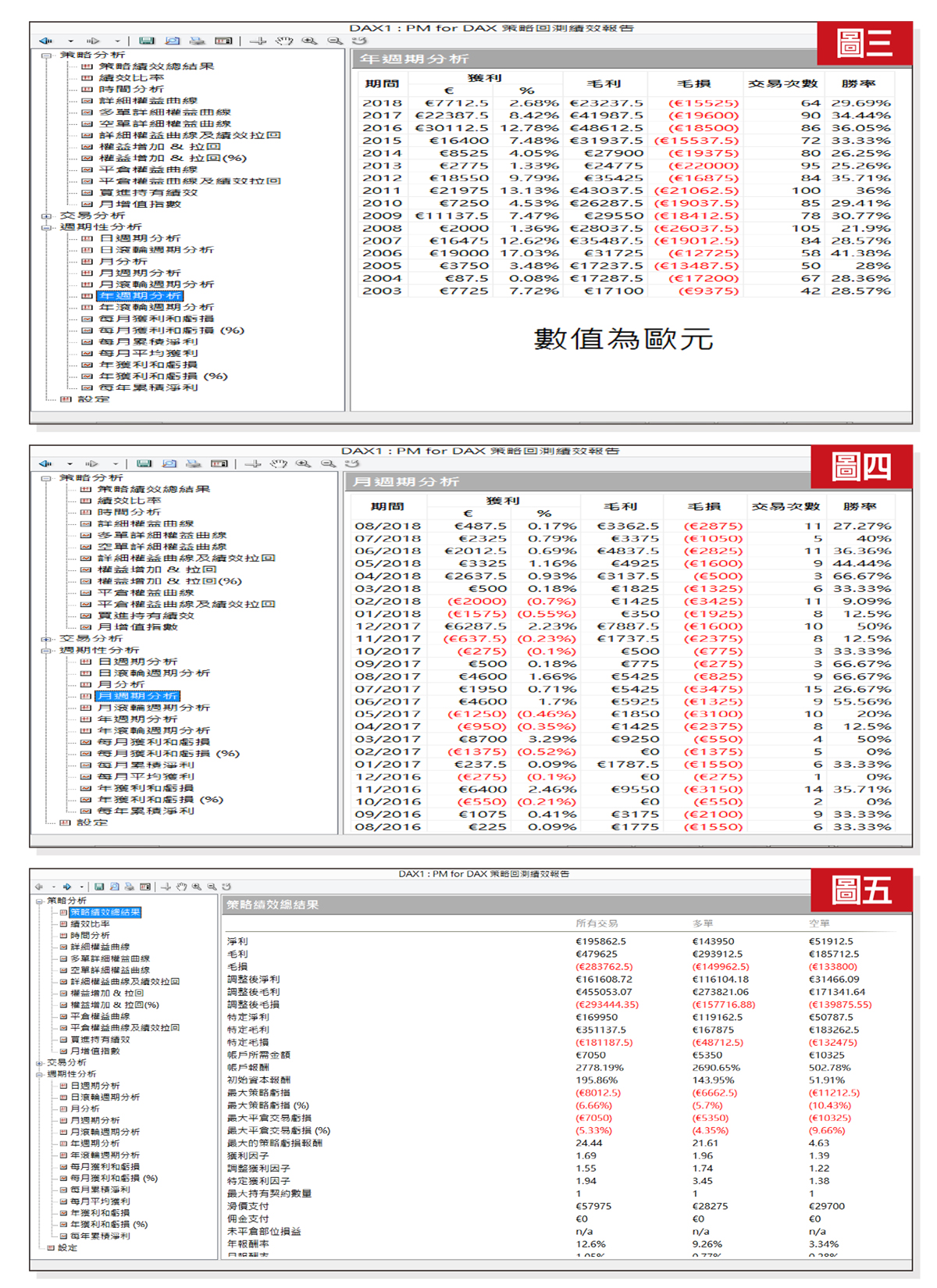 最小跳動點:德指最小跳動點是○.五點,不像台指期都是一點在跳動。像這樣每個跳動點不是一點的,程式內容需要配合修改,檢查所有指標的計算數值是否正確,例如KD黃金交叉、RSI強弱等等,是否達到該指標原始意義,導致正確的進場判斷。更重要的是停利停損的計算,應該以最小跳動格來計算,例如相對於台指期、二十點停損,德指最小跳動格○.五點的情況下,會是十大點的條件下停損。商品特性:每個商品特性不同,是否慣用在台指期的停損停利點是合適的?例如台指期二十點停損,德指是否要二十個最小跳動格停損,因為台指的瞬間波動其實算相對小,德指可能瞬間波動大,若依照台指的停損條件,可能很容易就造成停損,所以需要以德指過去十五年的歷史資料,回測分析找到最合適的停損條件。停利也一樣,移動停利的機制,也是要回測歷史資料,得到最佳參數以得到總體最佳的報酬。附圖是以操作德指一口來計算的獲利數字,要注意的是這些數字是歐元。從二○○三年到現在的獲利績效,圖二是策略程式的詳細權益曲線,在十五年的時間獲利大致呈現四十五度角持續向上。圖三是年週期報表,過去十五年中的每一年,即使今年還未結束,也都是正報酬,歐元兌台幣接近1:36,也就是將這些績效數字乘以36就是近似的台幣數值。所以不論遇到多頭、空頭、盤整的盤勢,這支程式都保持相當的獲利能力。圖四是月報表,可看出賺錢的月份明顯比賠錢的月份多。圖五是總績效表,二一○個月總獲利有大約十九萬多歐元,將近七百萬台幣,算是不錯的獲利。若您對海外期貨有興趣,歡迎共同來驗證。